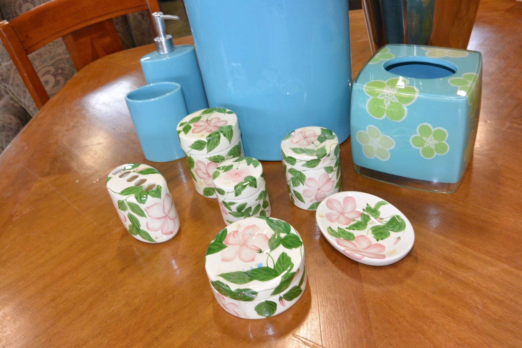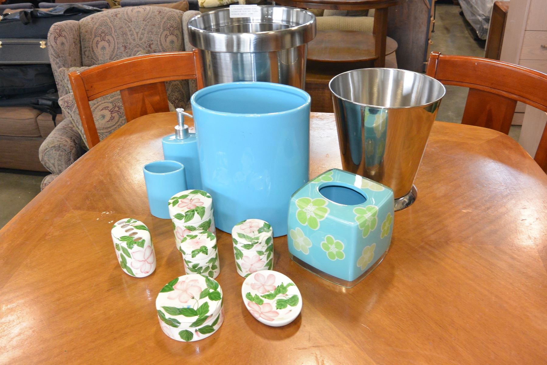 2 STAINLESS GARABGE BINS, DECORATIVE BLUE AND FLORAL BATHROOM VANITY ITEMS