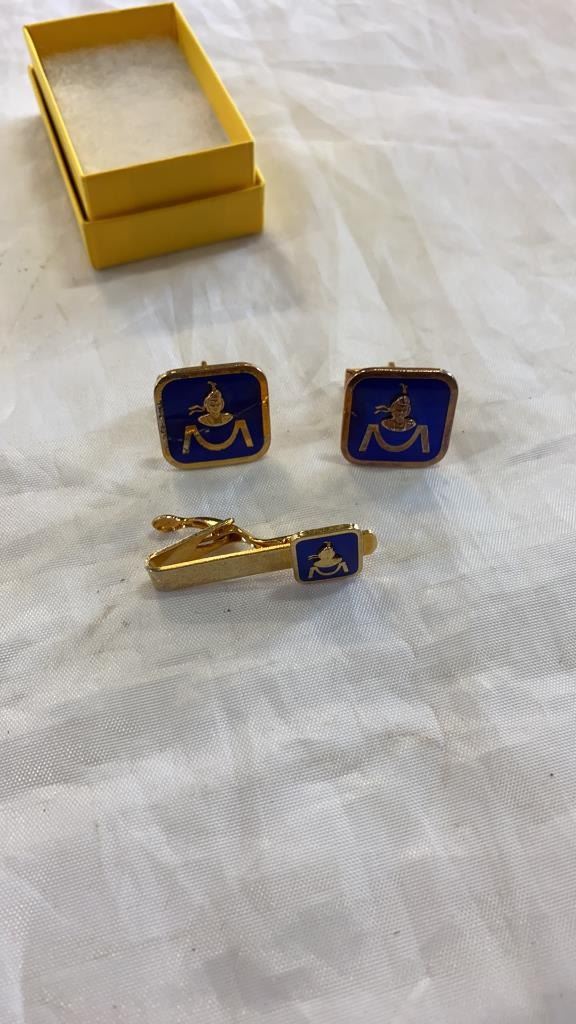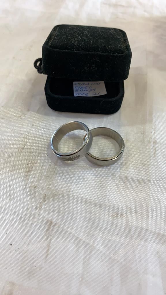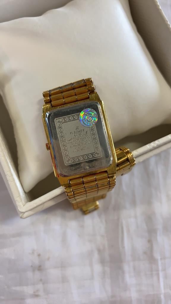 2 STAINLESS RINGS, CUFFLINK AND PIN SET, AND FISCHER 24KT PLATED WATCH