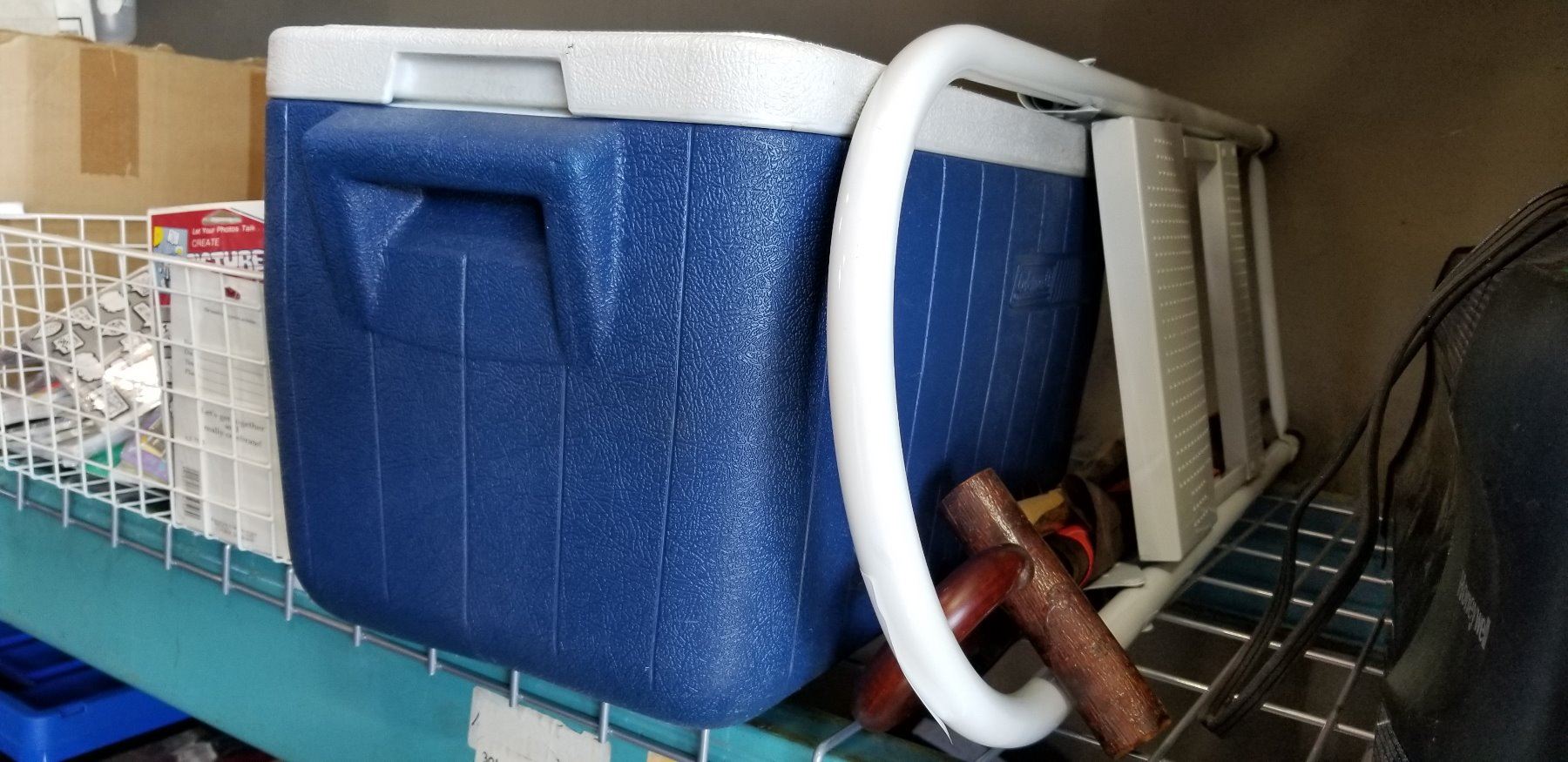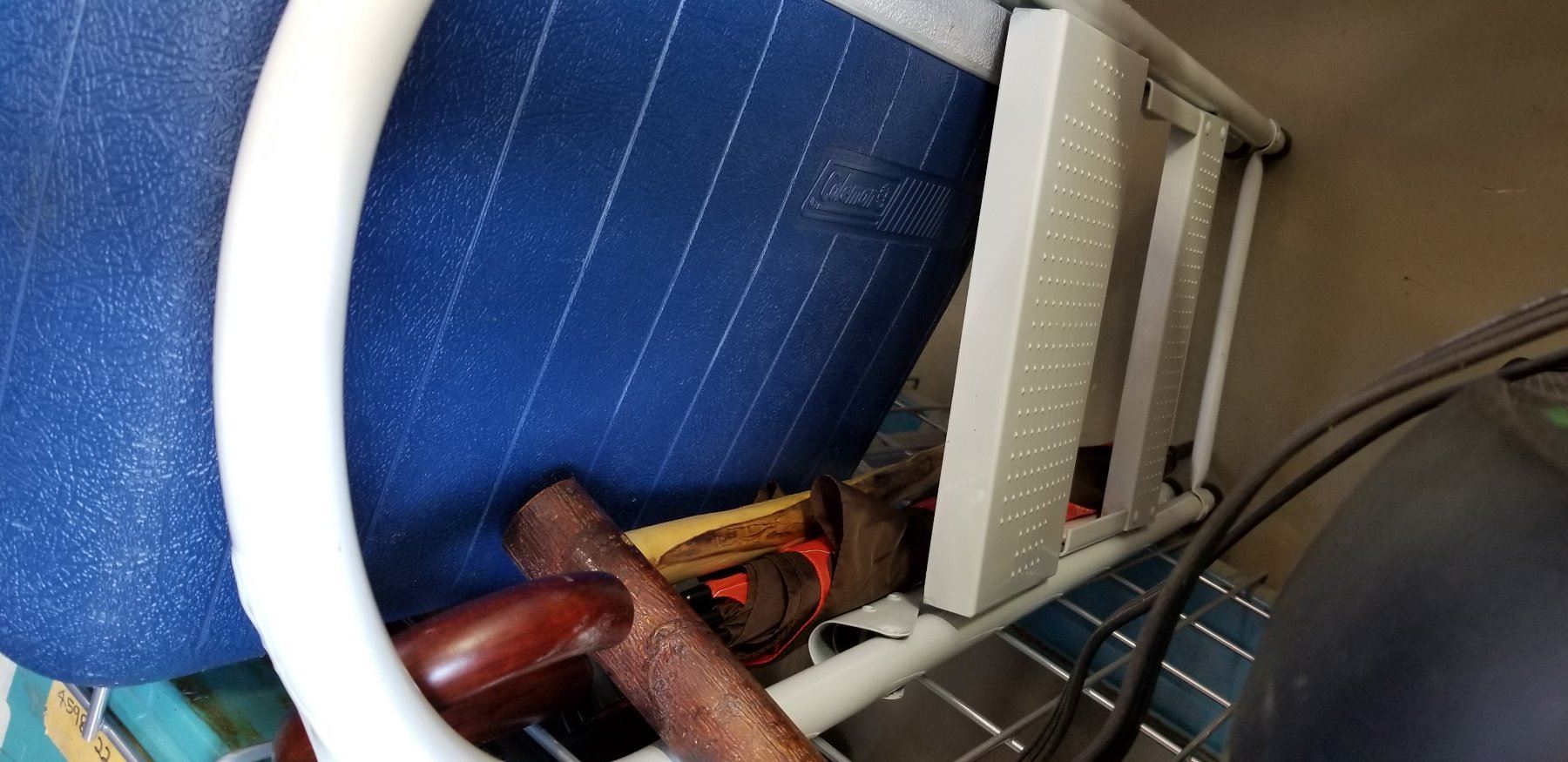 2-STEP STOOL, CAMRY SCALE, COLEMAN COOLER, CANE, AND UMBRELLA