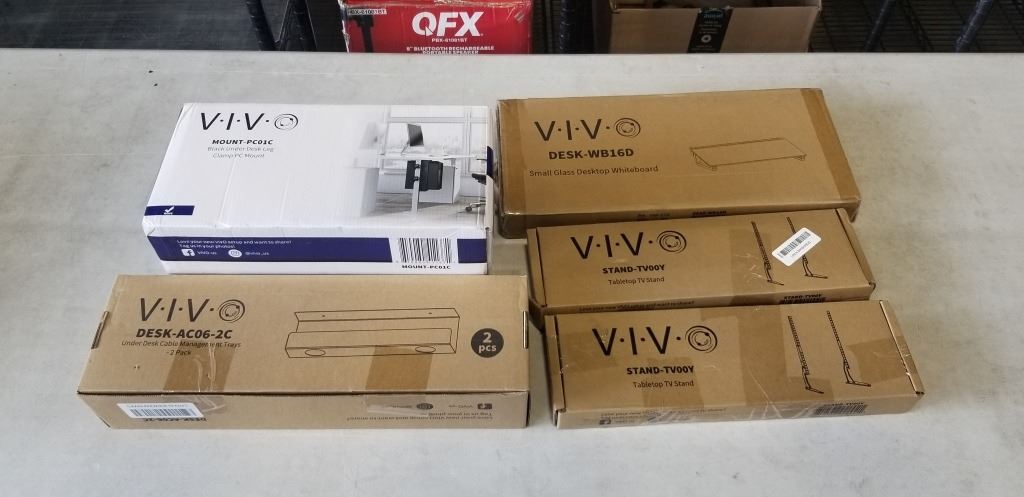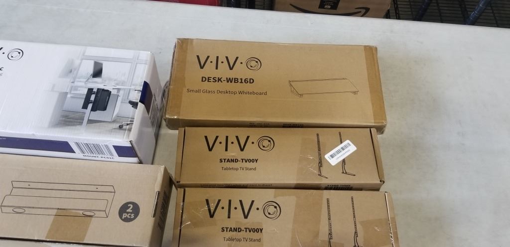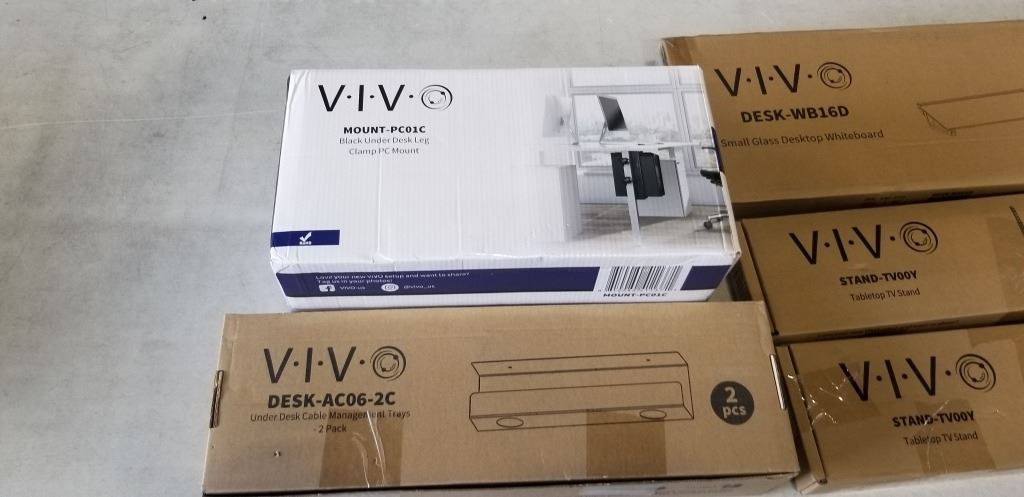 2 TABLETOP TV STANDS, UNDER DESK PC MOUNT, GLASS DESKTOP WHITEBOARD AND CORD MANAGEMENT TRAYS