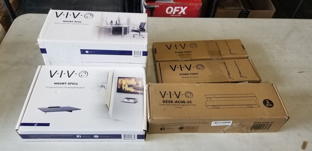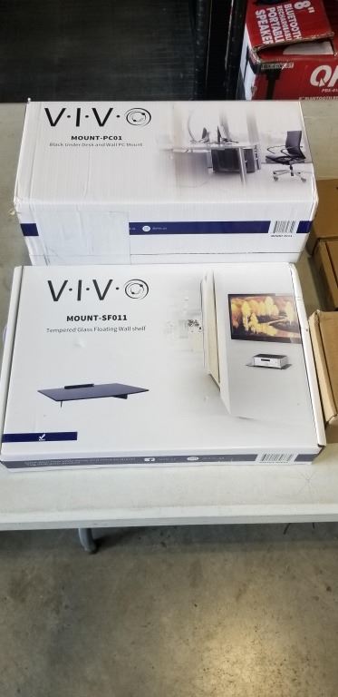 2 TABLETOP TV STANDS, UNDER DESK PC MOUNT, GLASS FLOATING WALL SHELF AND CORD MANAGEMENT TRAYS