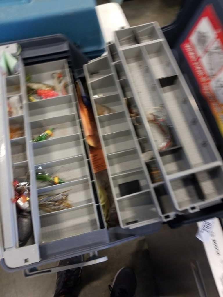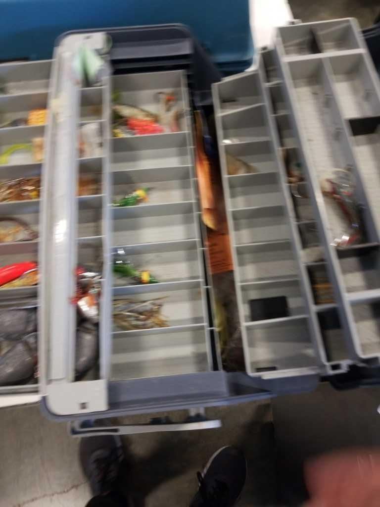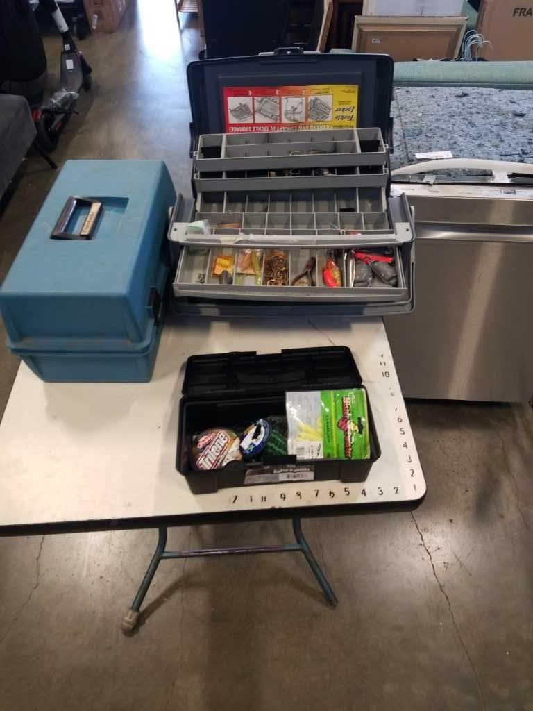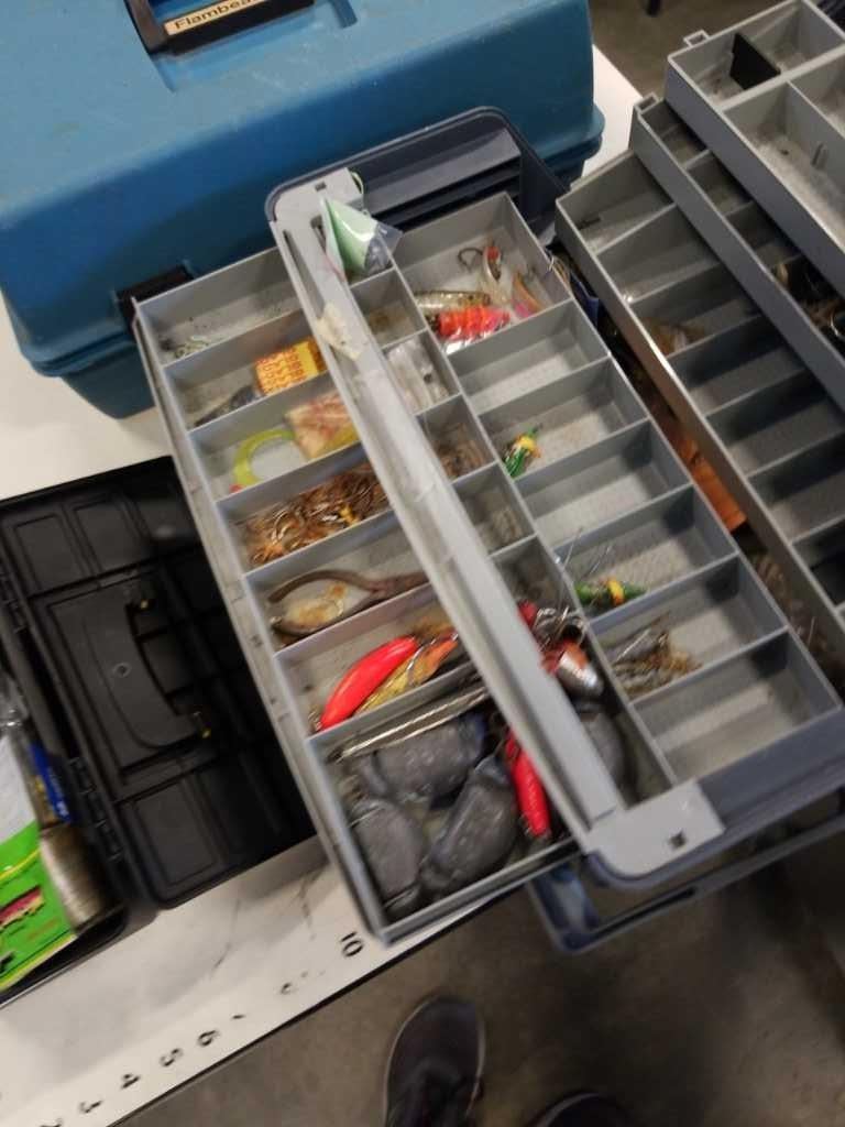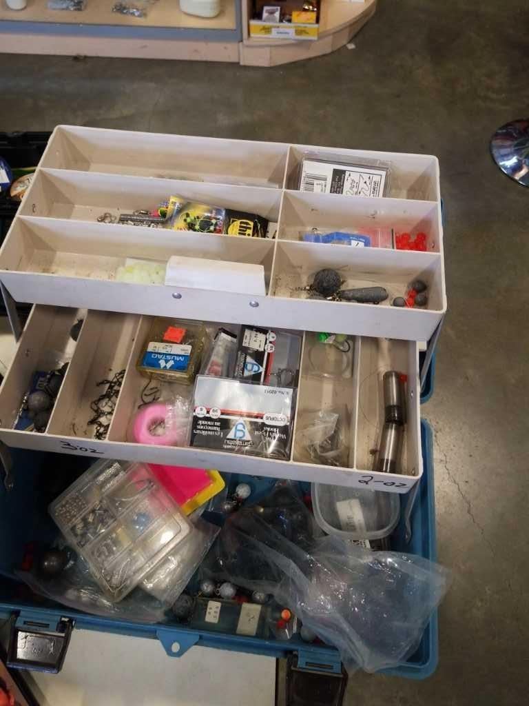 2 TACKLE BOXES WITH CONTENTS AND MINI TOOLBOX WITH LINE AND MORE
