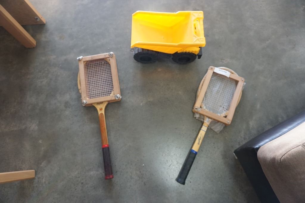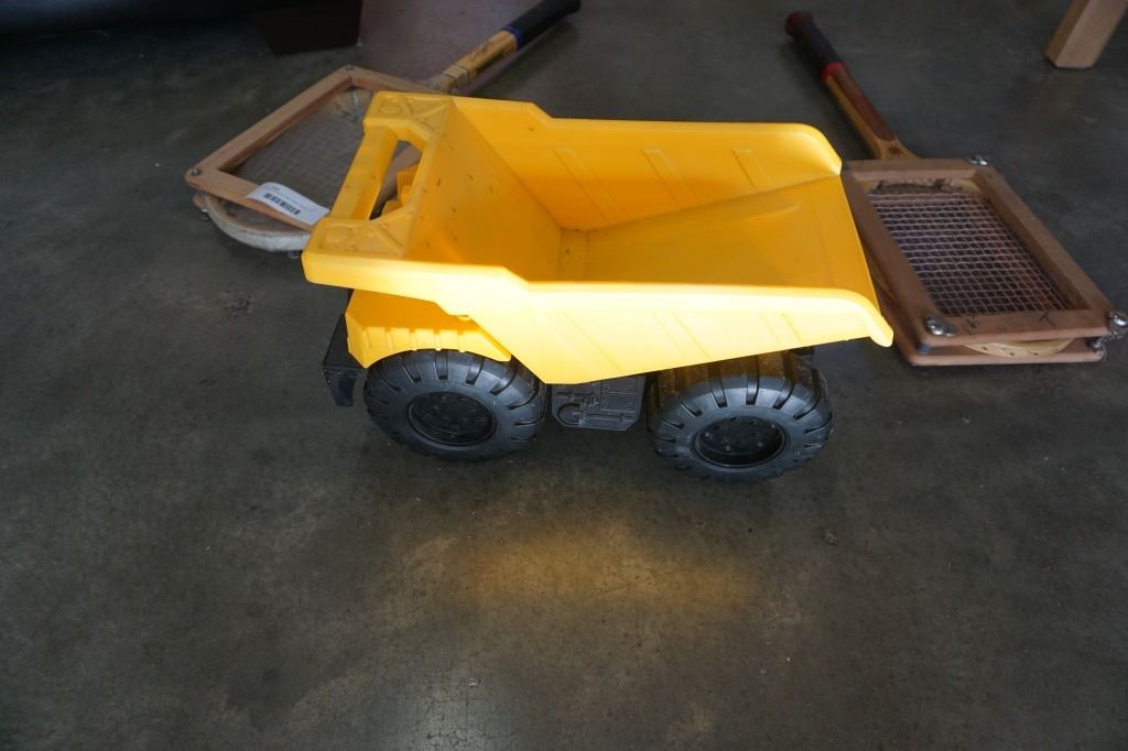 2 TENNIS RACKETS AND DUMP TRUCK TOY