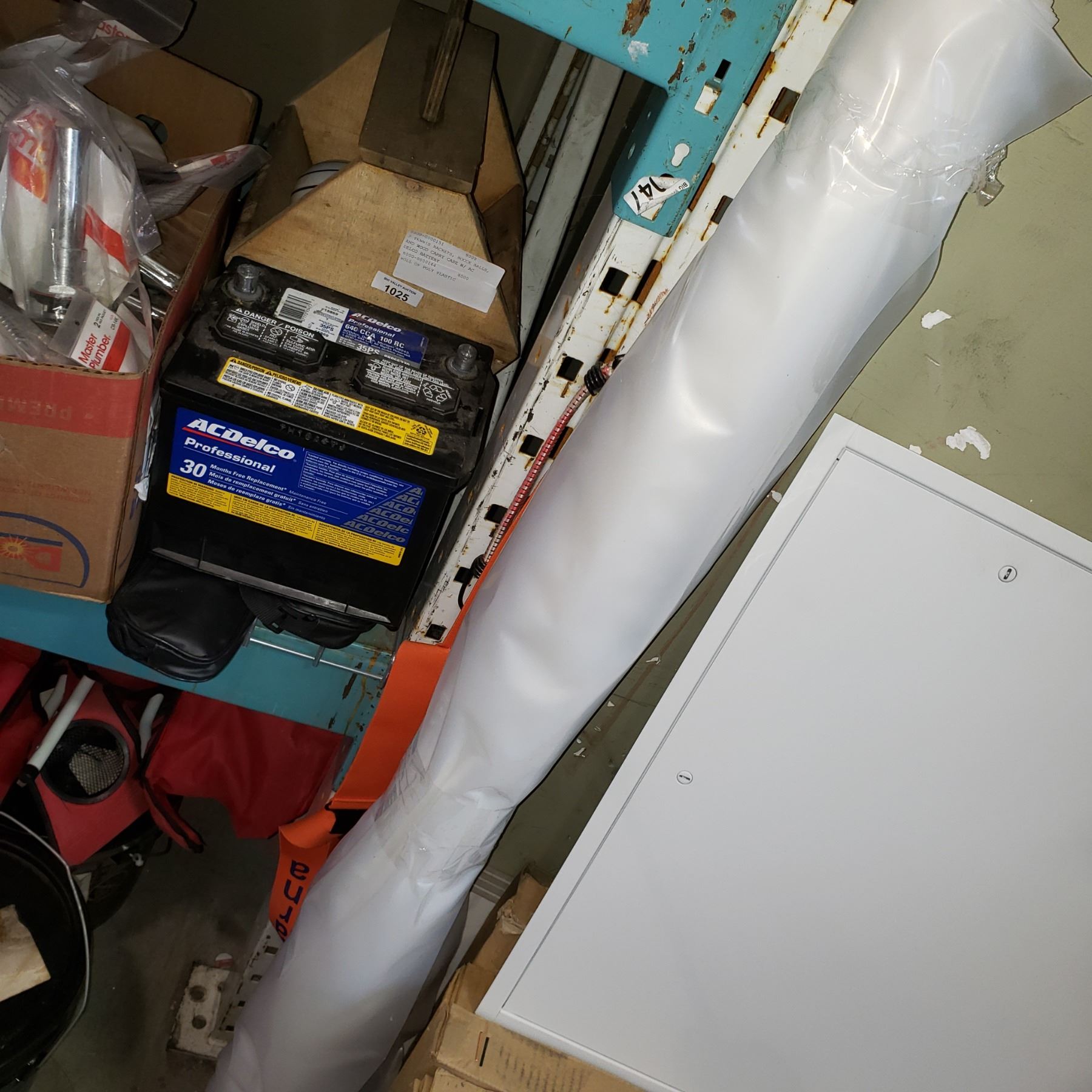 2 TENNIS RACKETS, BOCCE BALLS, AND WOOD CARRY CASE W/ AC DELCO BATTERY AND ROLL OF POLY PLASTIC