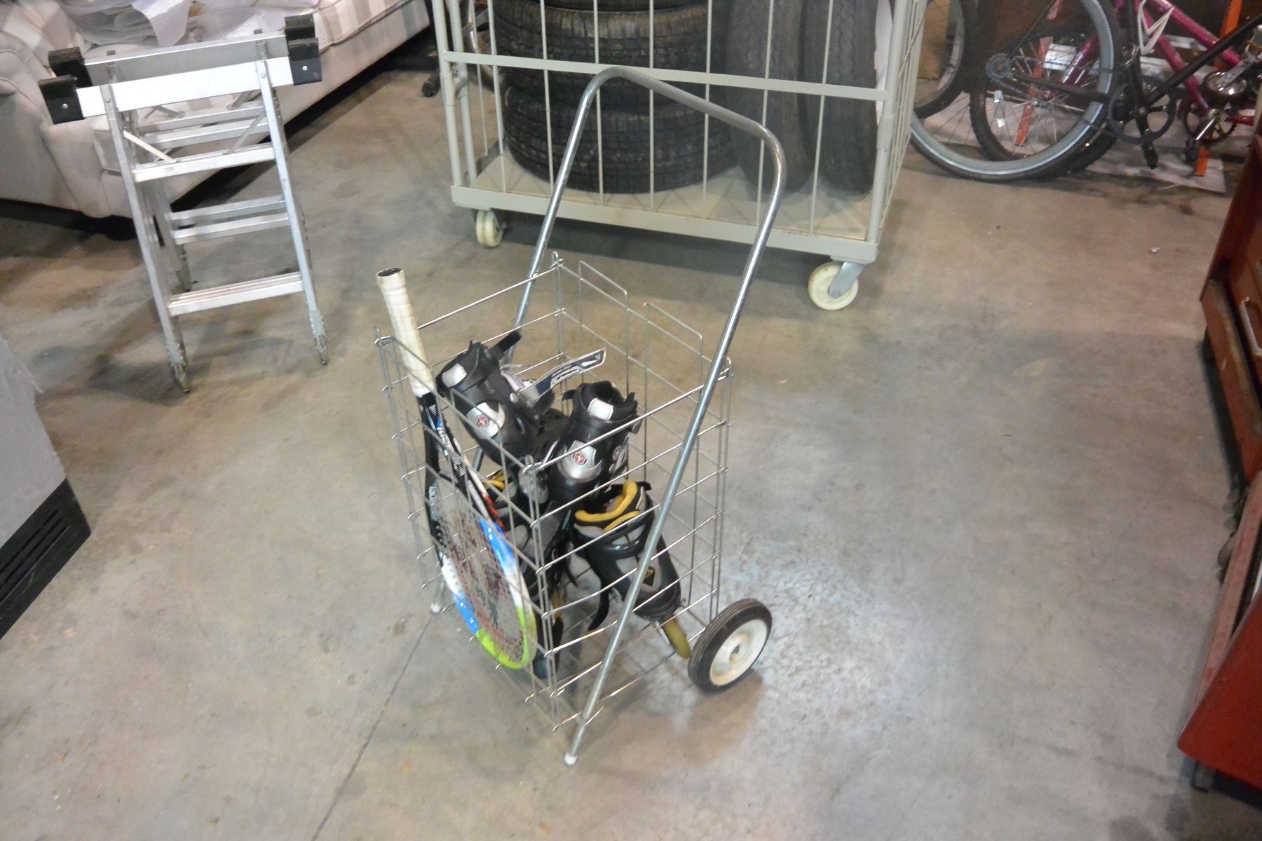 2 TENNIST RAQUETS, AND METAL 2-WHEEL SHOPPING CART W/ 2 PAIRS OF ROLLERS