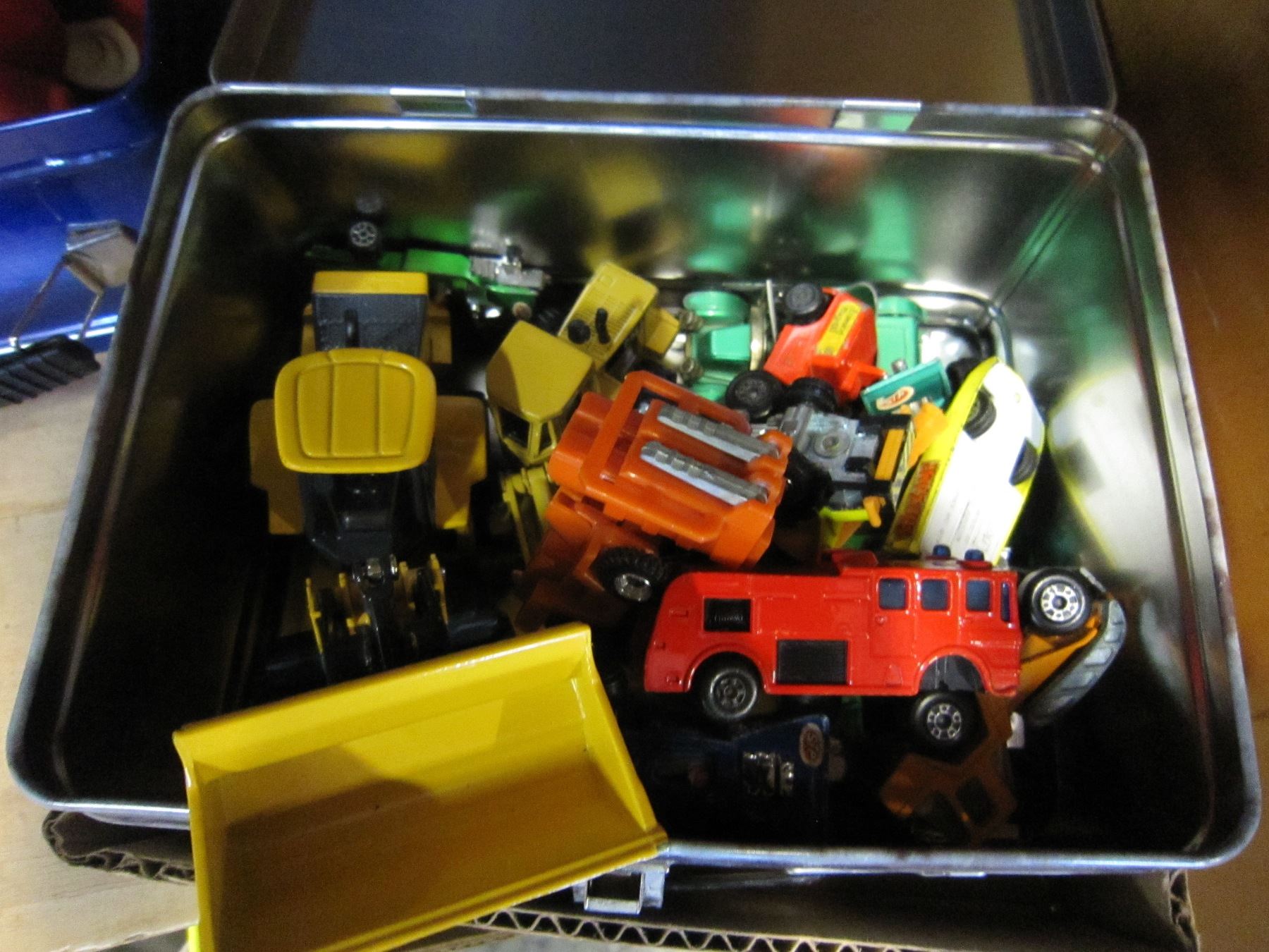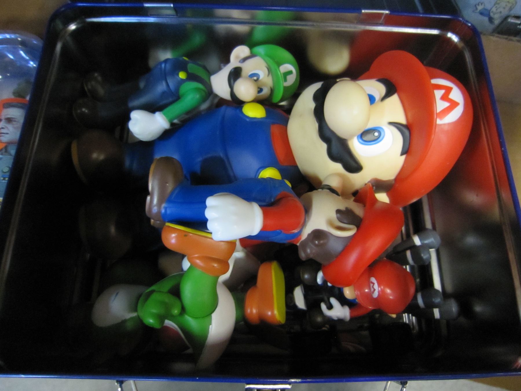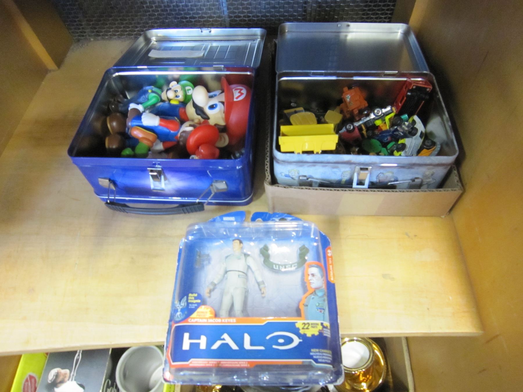 2 TIN LUNCH BOXES OF DIE CAST VEHICLES AND NINTENDO FIGURES