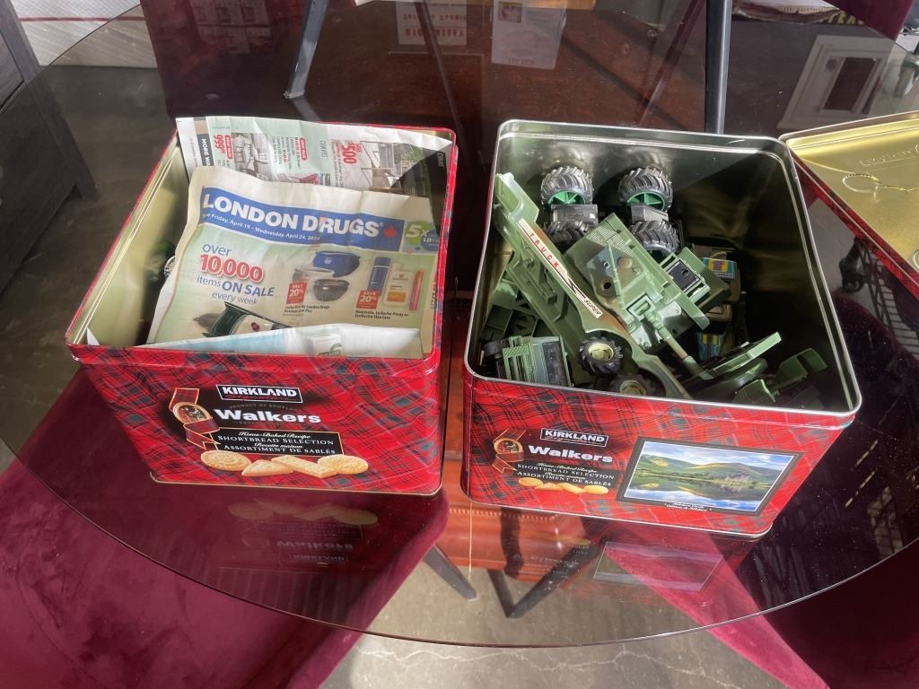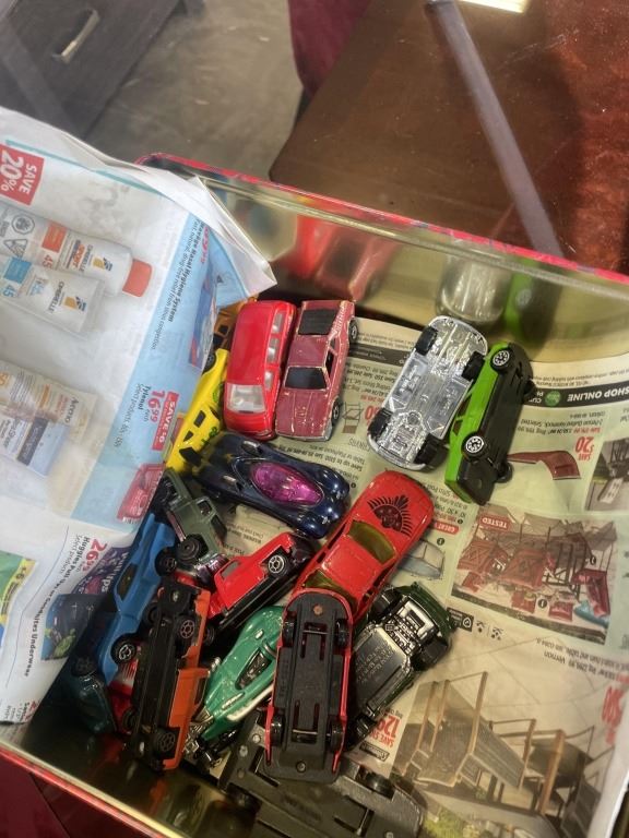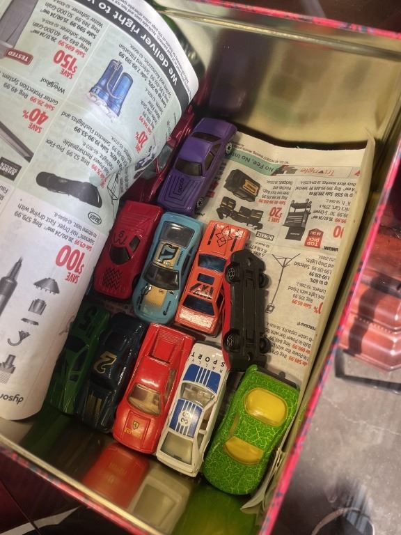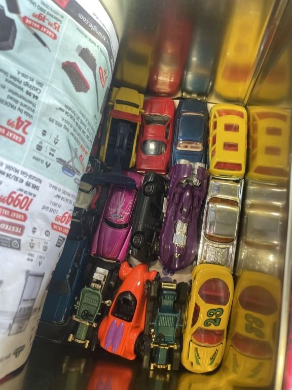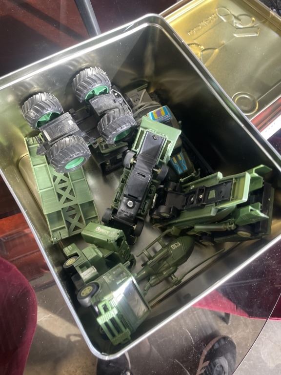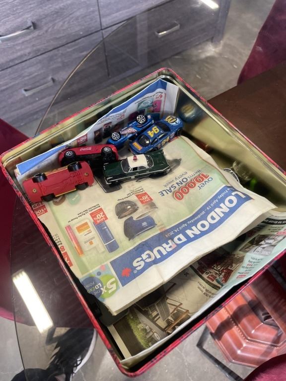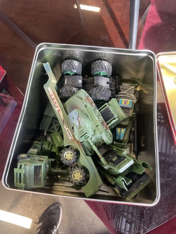 2 TINS OF VINTAGE DIE CAST CARS AND TRUCKS