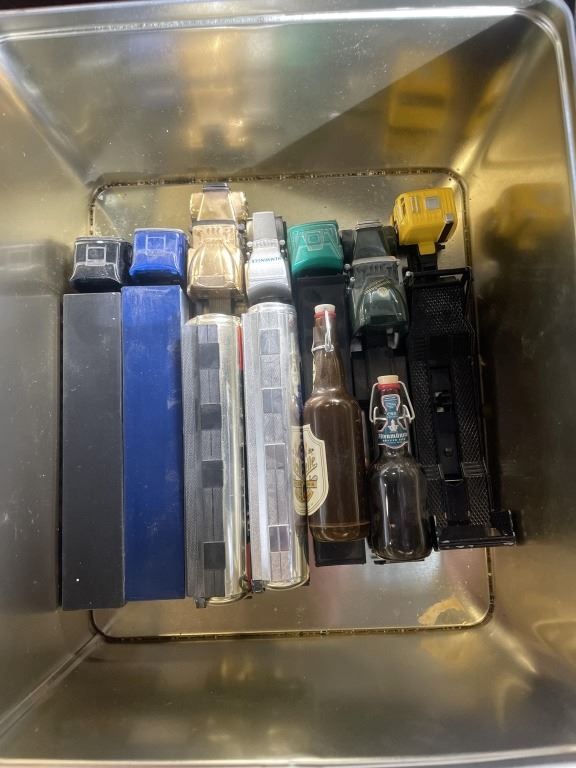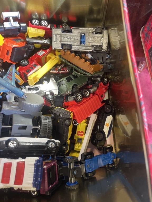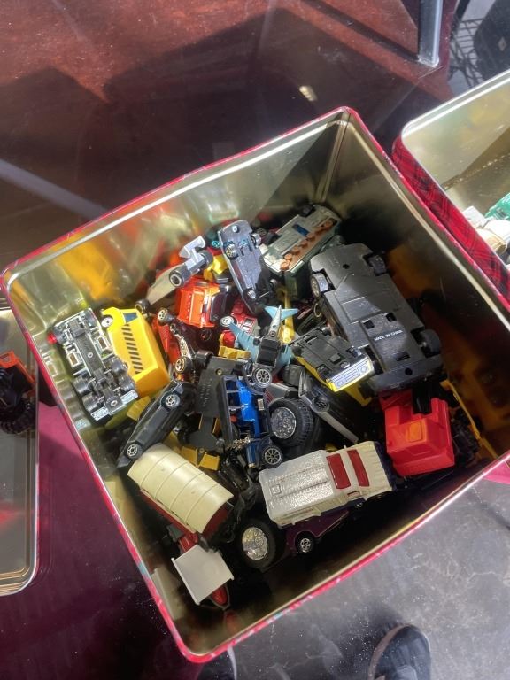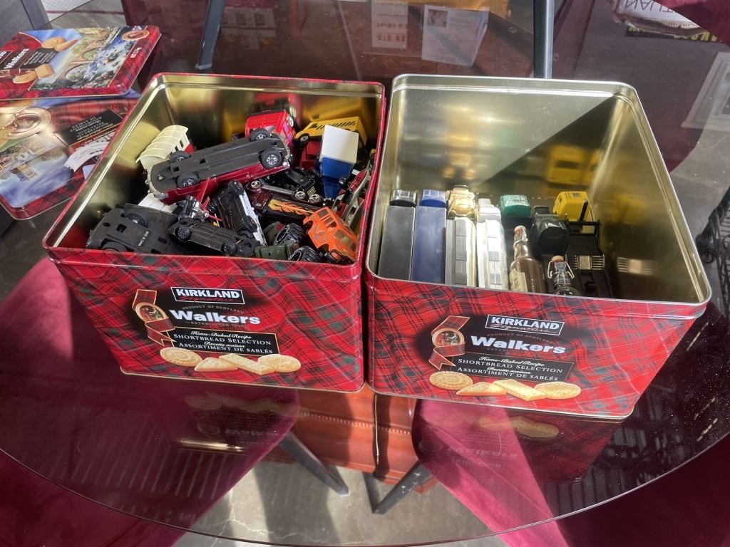 2 TINS OF VINTAGE DIE CAST CARS AND TRUCKS