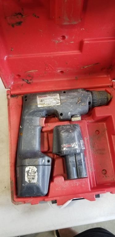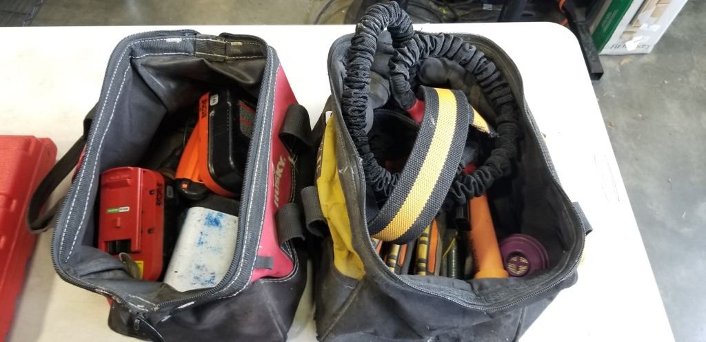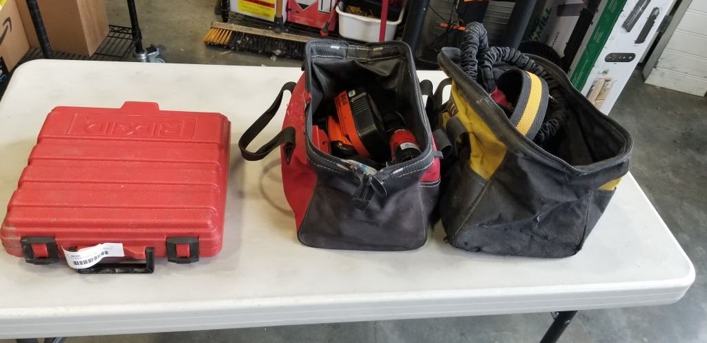 2 TOOLS BAGS, 2 TOOLS BATTERIES WITH CHARGER AND RIDGID DRILL