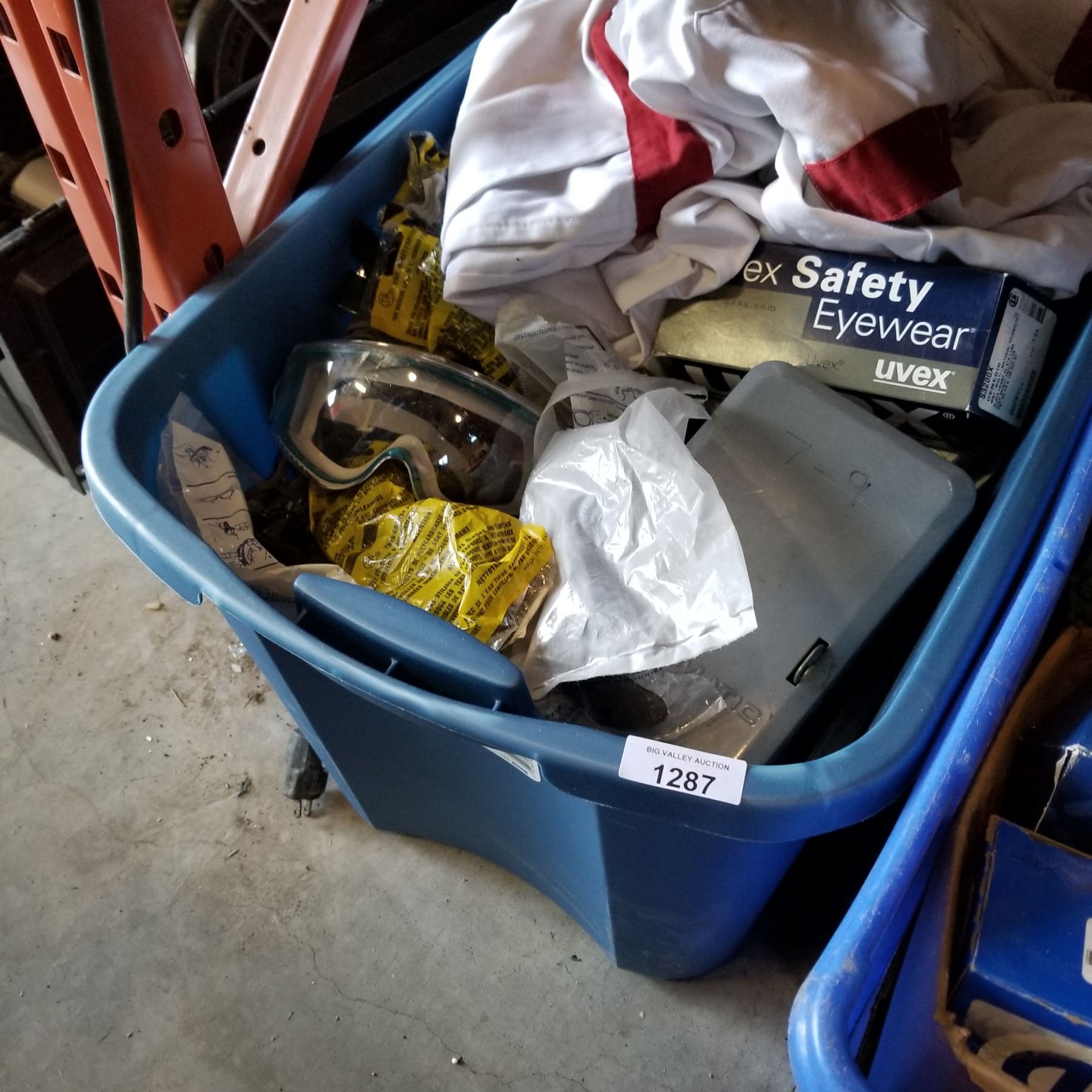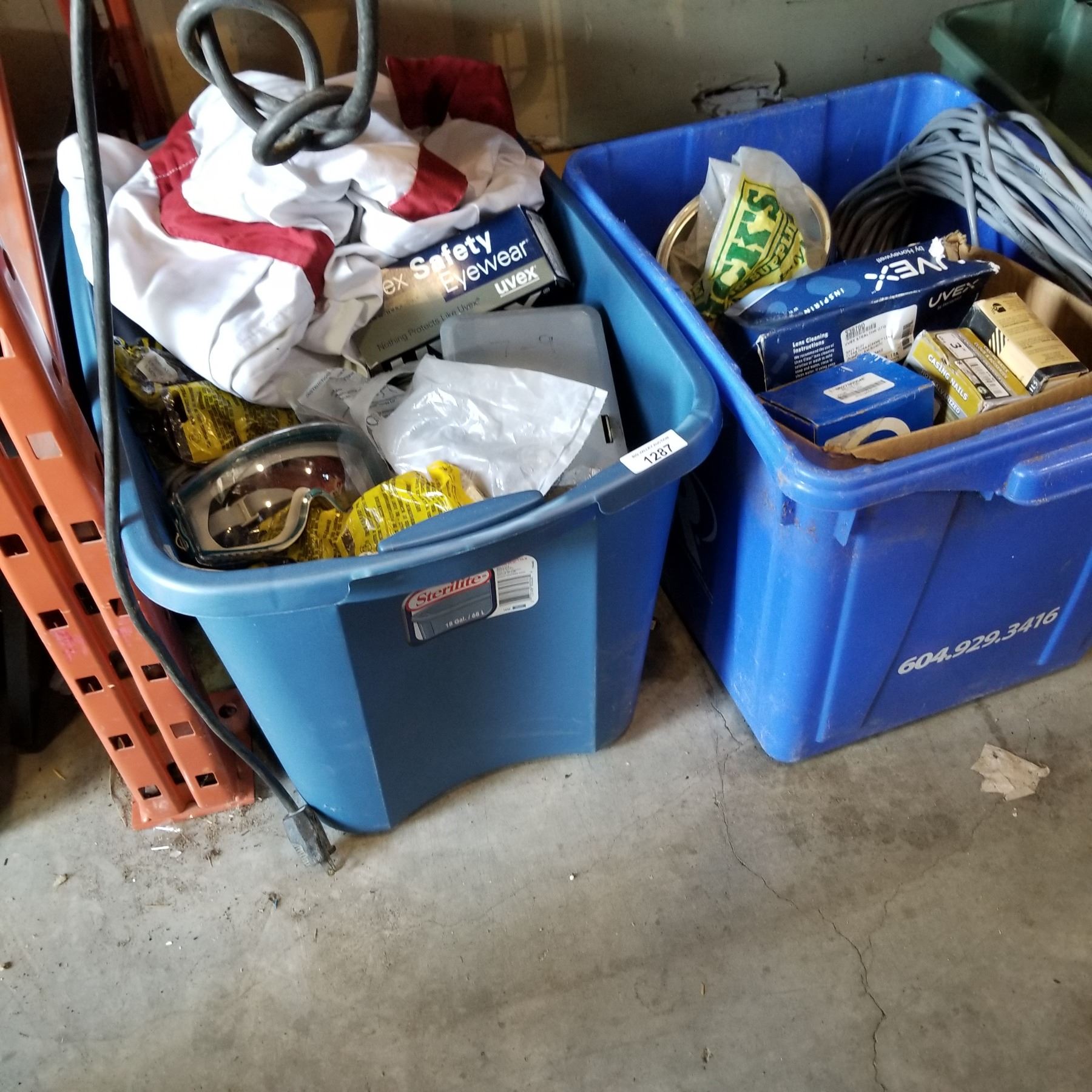 2 TOTE OF ELECTRICAL WIRE, DRYWALL TOOLS, AND MORE AND TOTE OF OVERALLS AND SAFETY GEAR