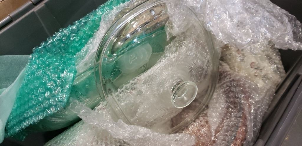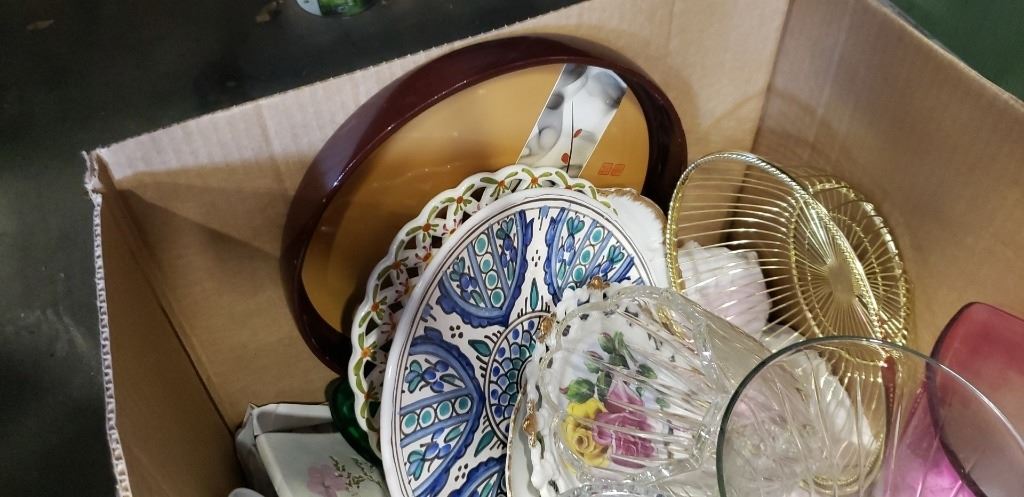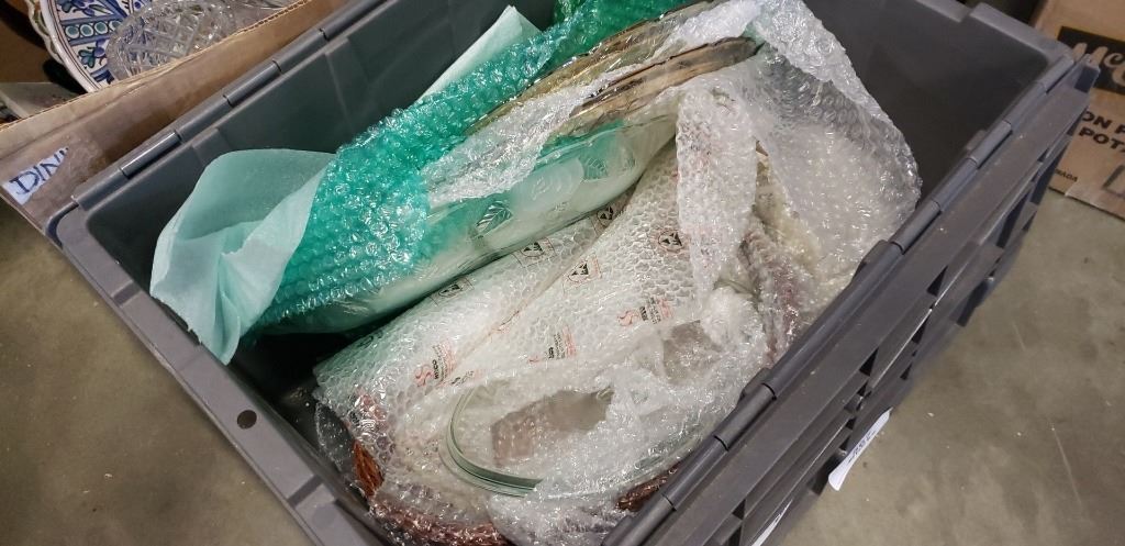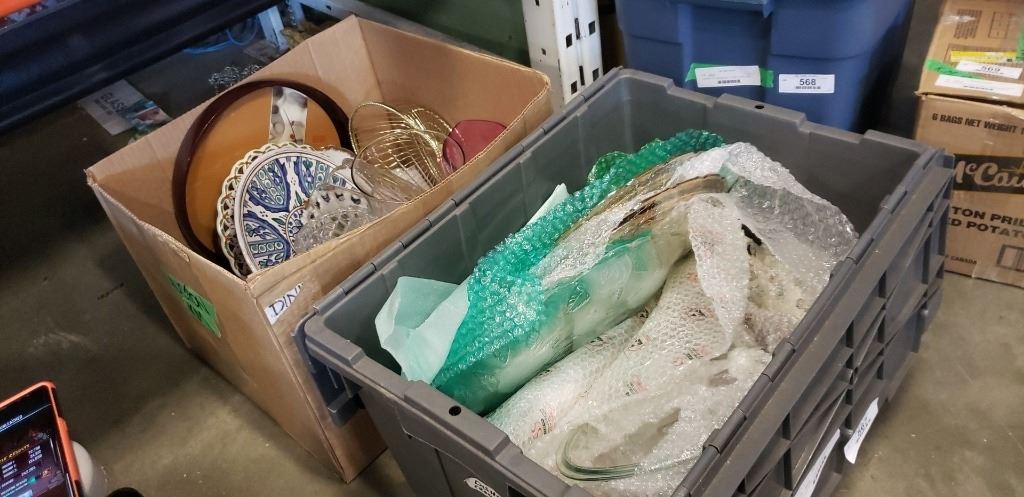 2 TOTES OF DECORATIVE HOUSEWARES, PLATTERS, ETC