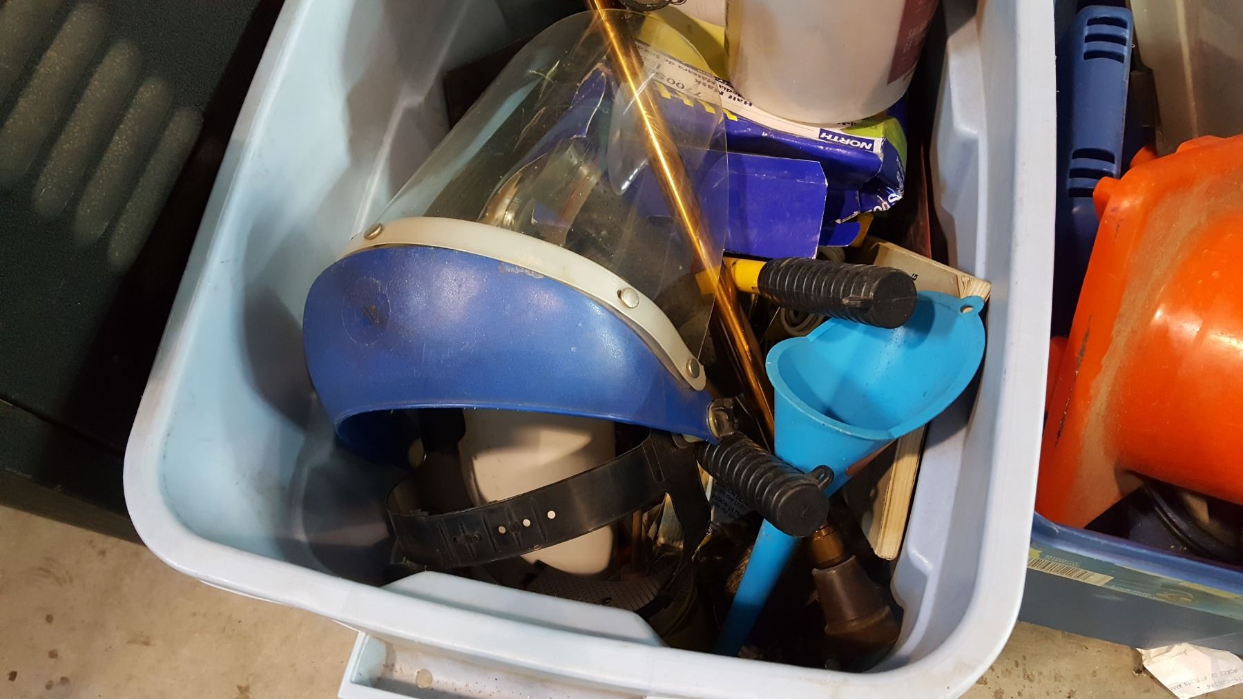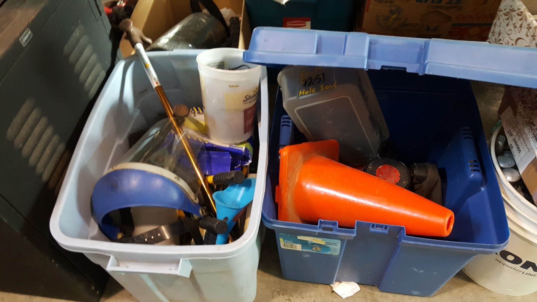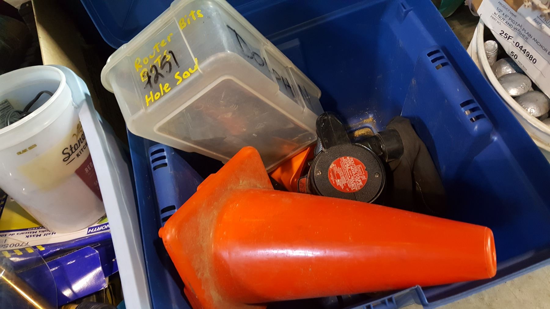 2 TOTES OF TOOLS, RESPIRATOR MASK, AND ROUTER