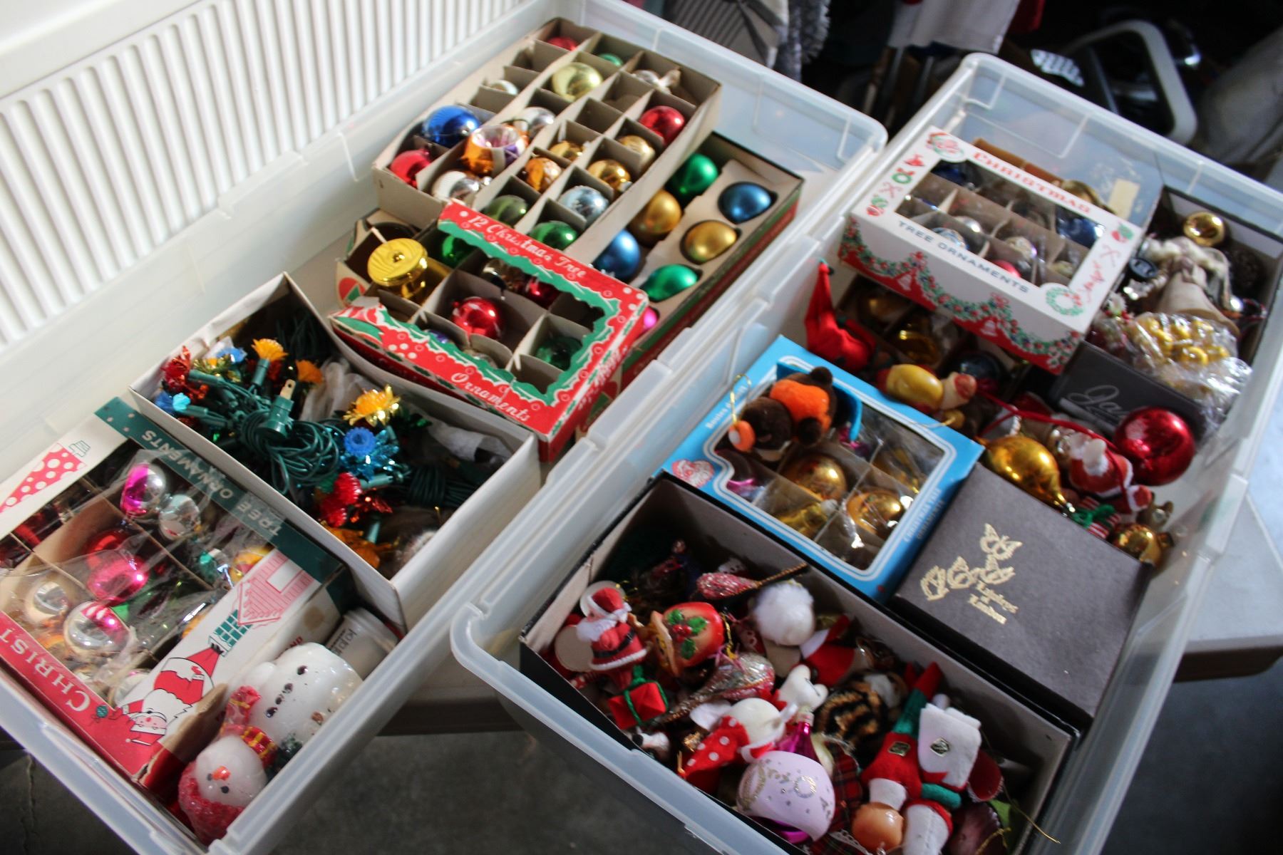 2 TOTES OF VINTAGE CHRISTMAS ORNAMENTS