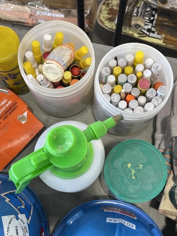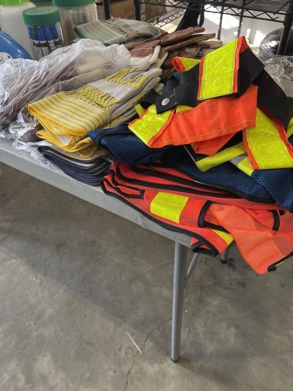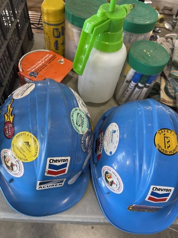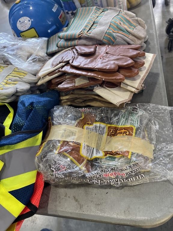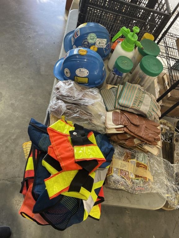 2 TOTES WITH WORK GLOVES, SAFETY GEAR, HARD HATS ETC