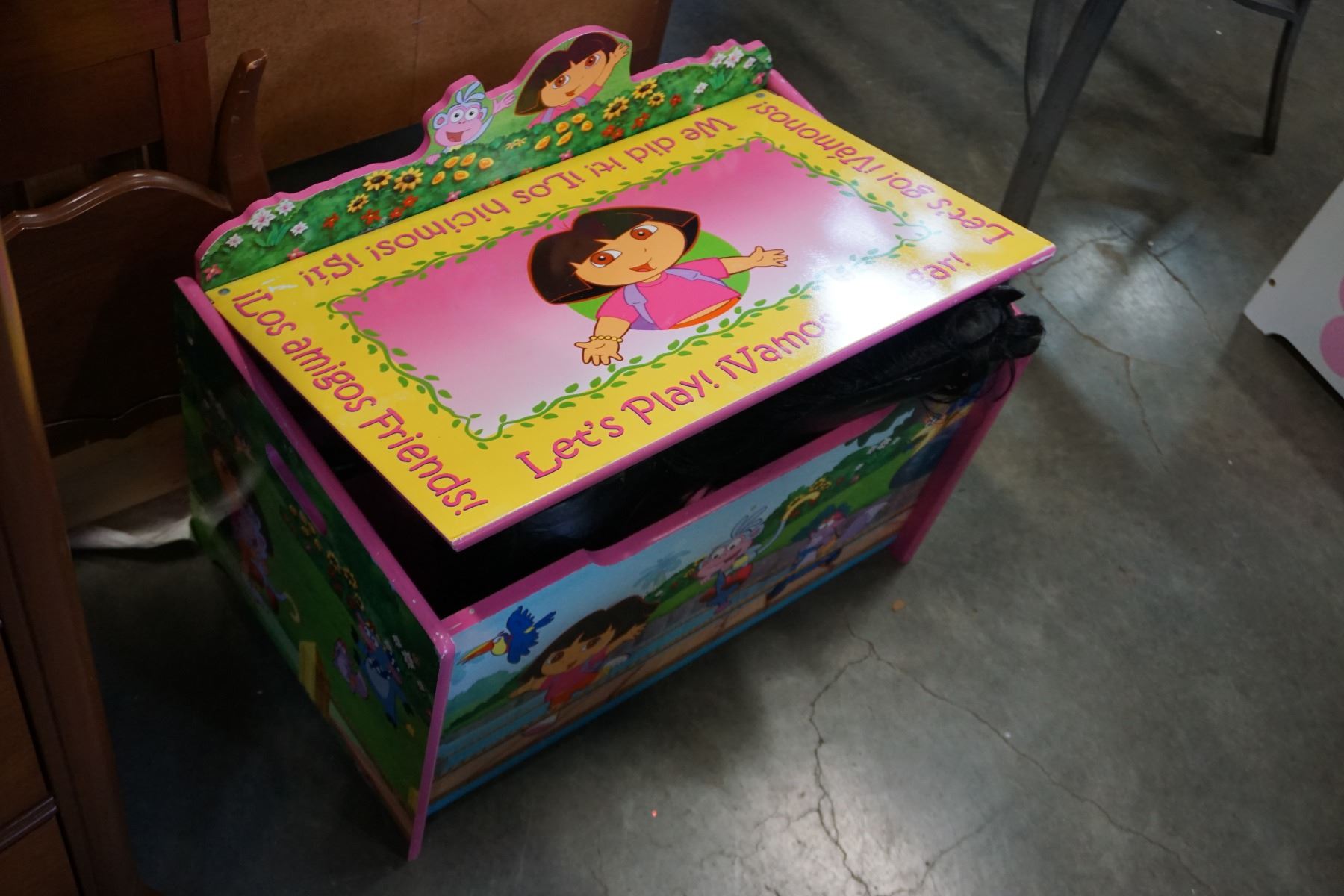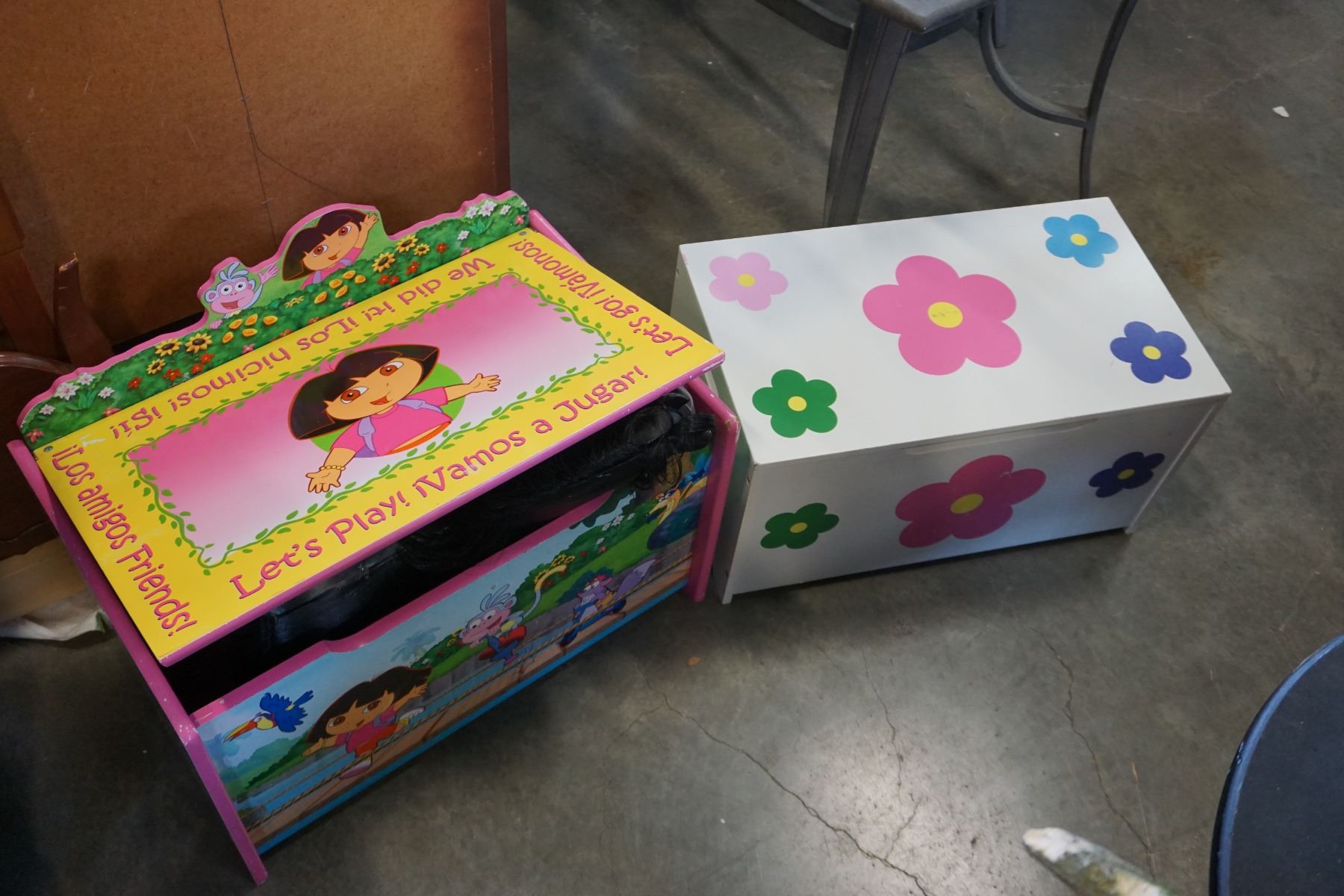 2 TOY BOXES DORA AND FLOWERED W/ BLACK PLASTIC HORSE