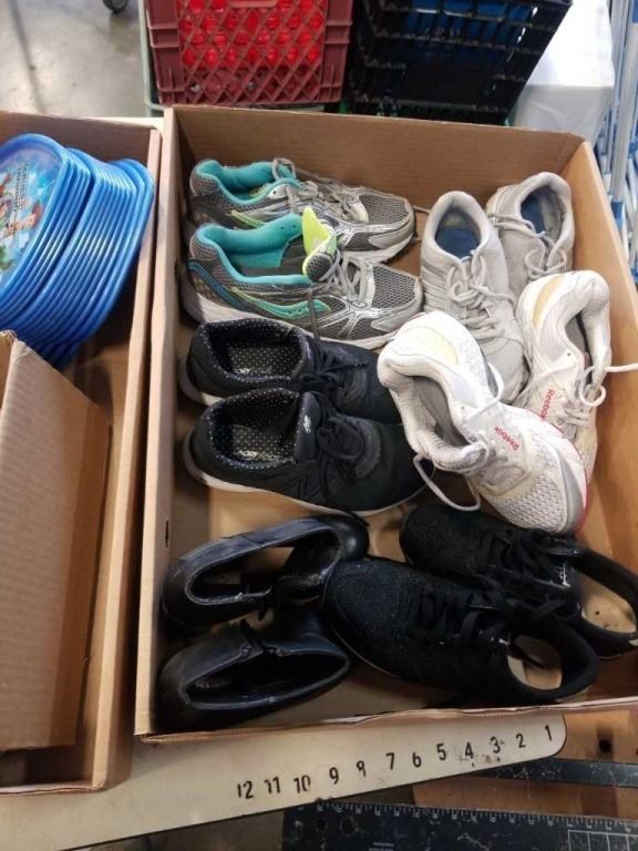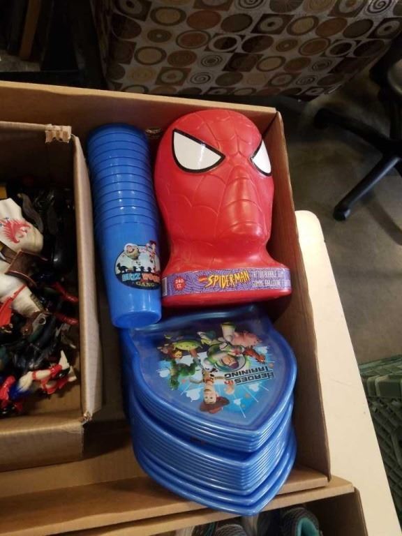 2 TRAYS OF ACTION FIGURES, SPIDERMAN, BATMAN, SIZE 6.5 TO 8 1/2 LADIES SHOES, TOY STORY CUPS AND PLATES