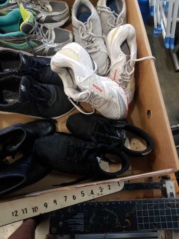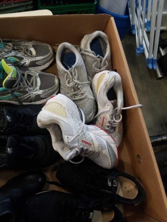 2 TRAYS OF ACTION FIGURES, SPIDERMAN, BATMAN, SIZE 6.5 TO 8 1/2 LADIES SHOES, TOY STORY CUPS AND PLA