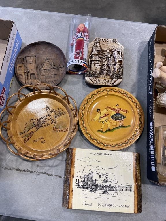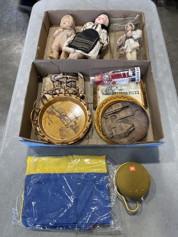 2 TRAYS OF ANTIQUE COLLECTOR DOLLS, PLATES ETC