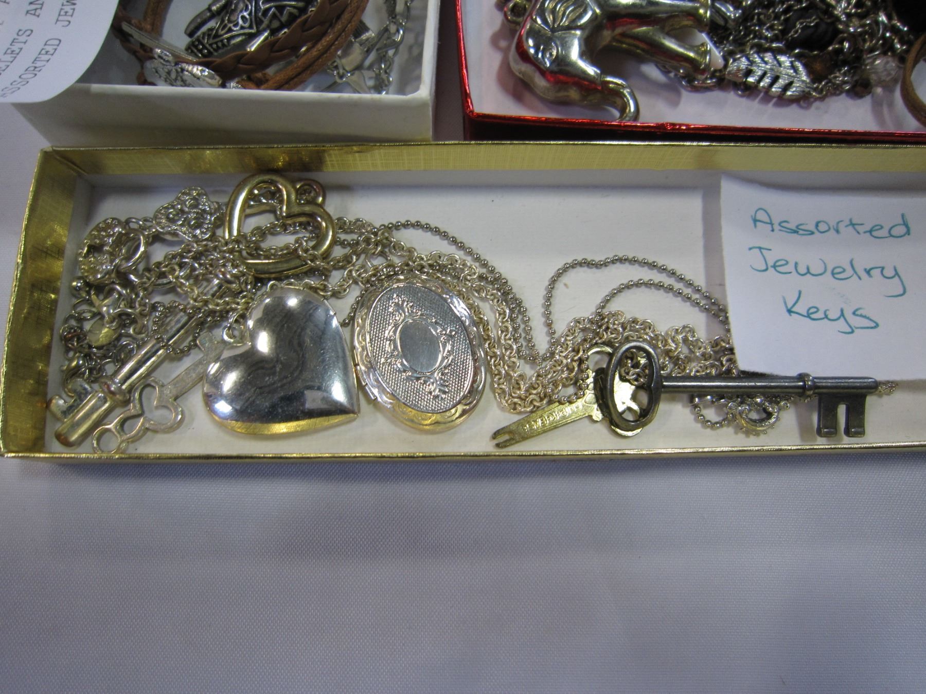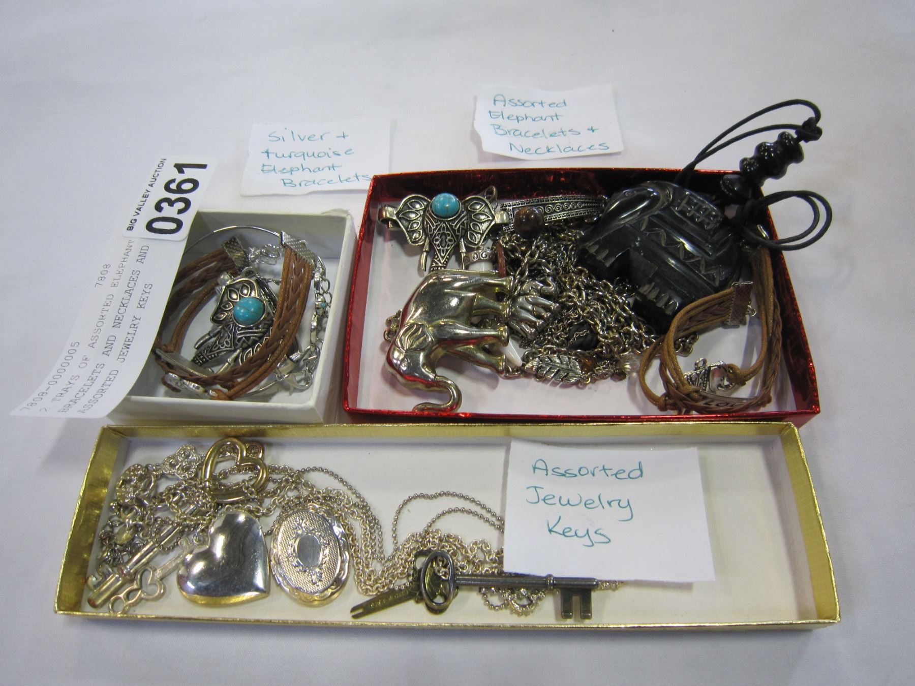 2 TRAYS OF ASSORTED ELEPHANT BRACELETS AND NECKLACES AND ASSORTED JEWELRY KEYS
