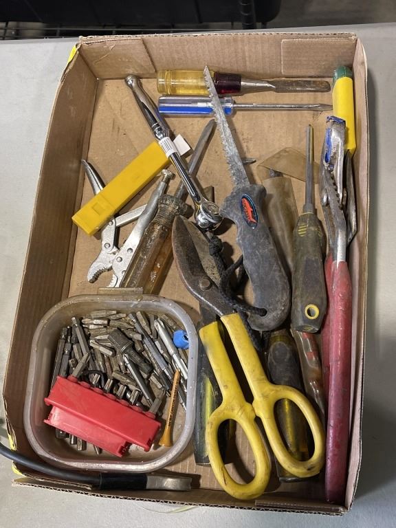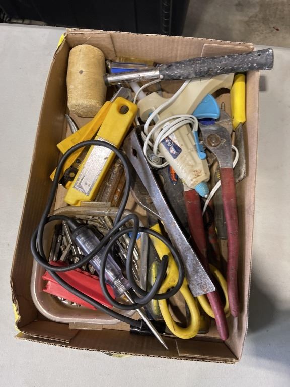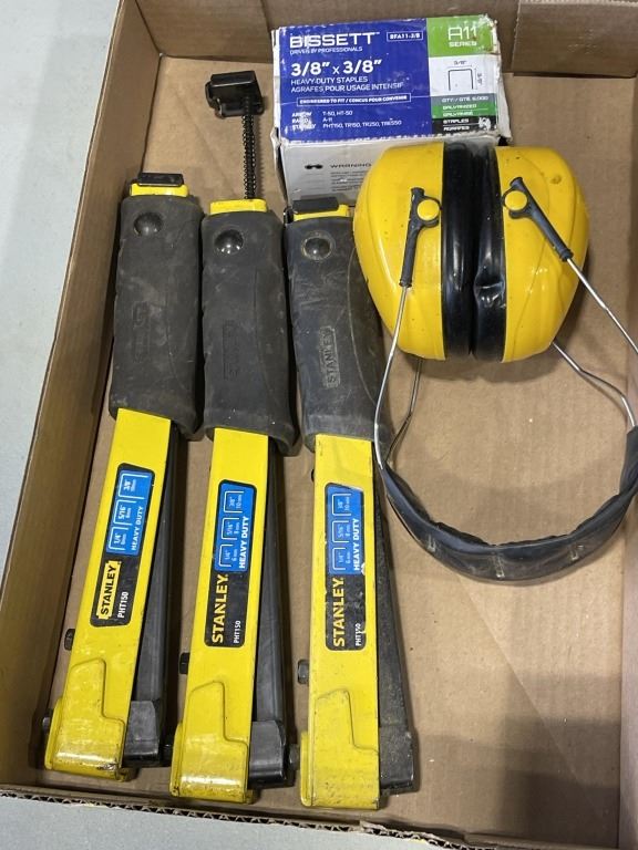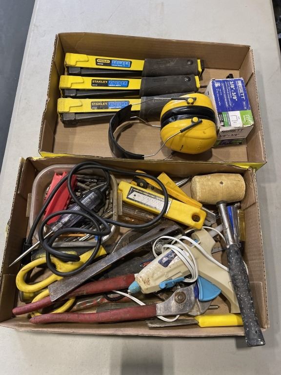 2 TRAYS OF ASSORTED HAND TOOLS, STAPLERS ETC