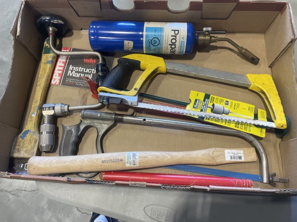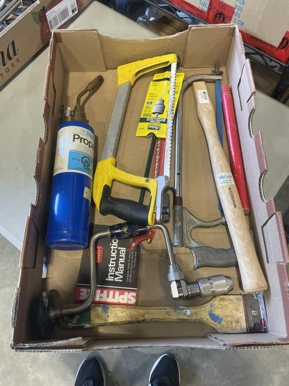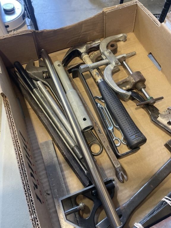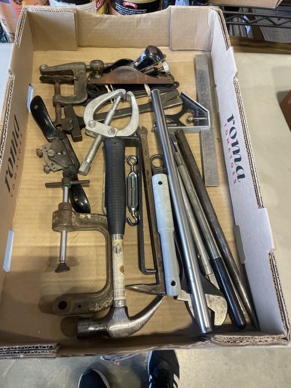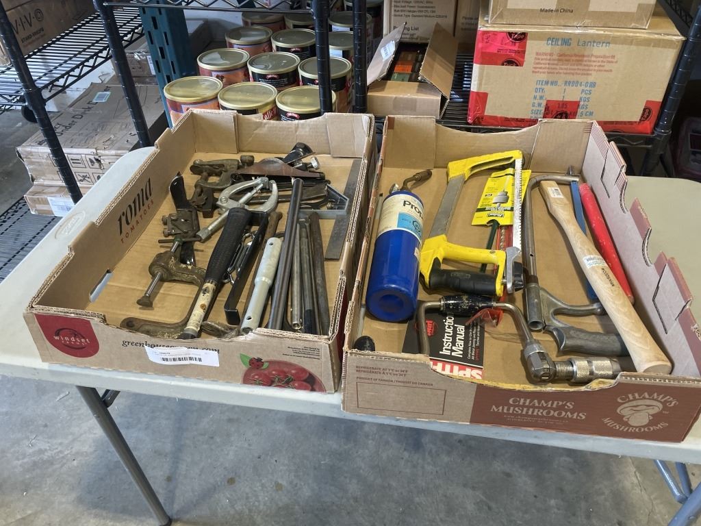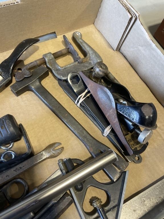 2 TRAYS OF ASSORTED HAND TOOLS, WOOD PLANE, HAMMER AND NAIL PULLERS ETC