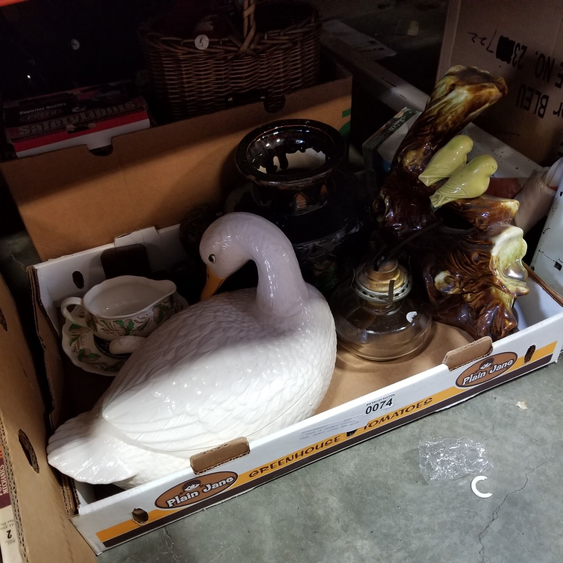 2 TRAYS OF CERAMIC FIGURES, VASE, SAFETY LIGHT, AND DECOR