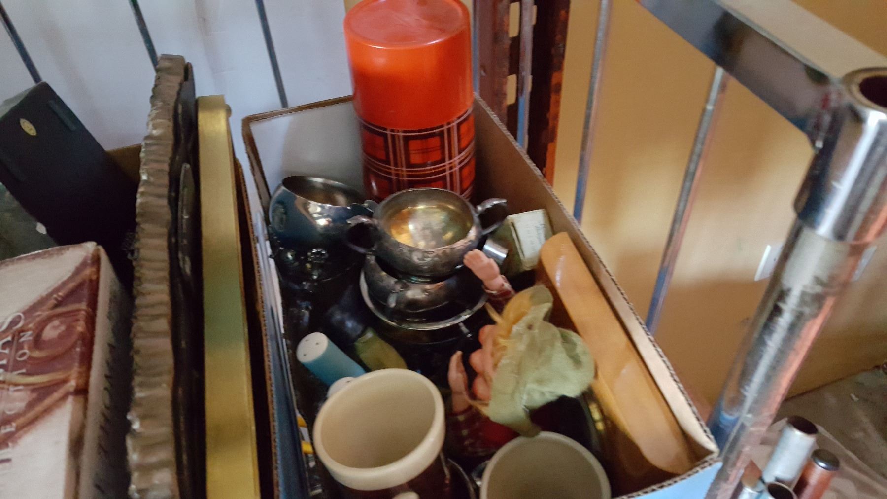 2 TRAYS OF COLLECTABLES, SILVER PLATE, AND DECORATIVE TILES