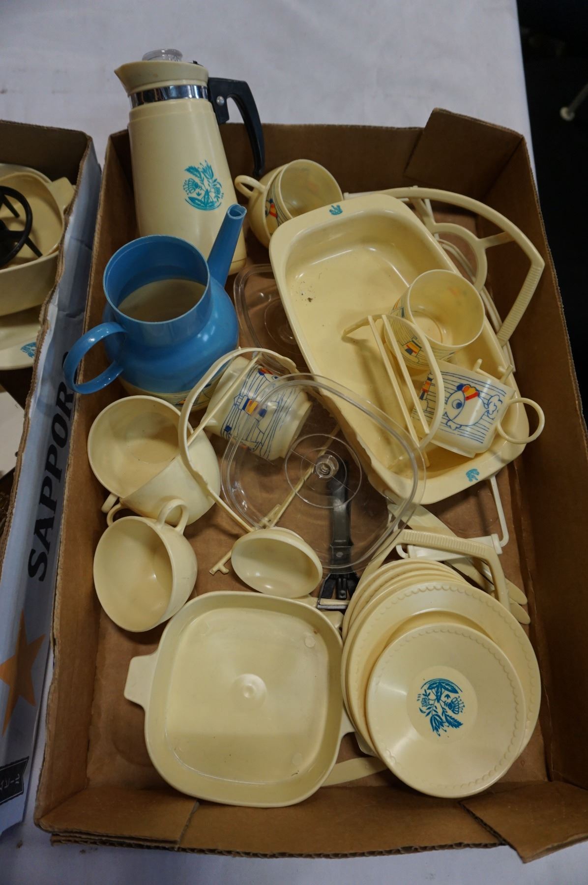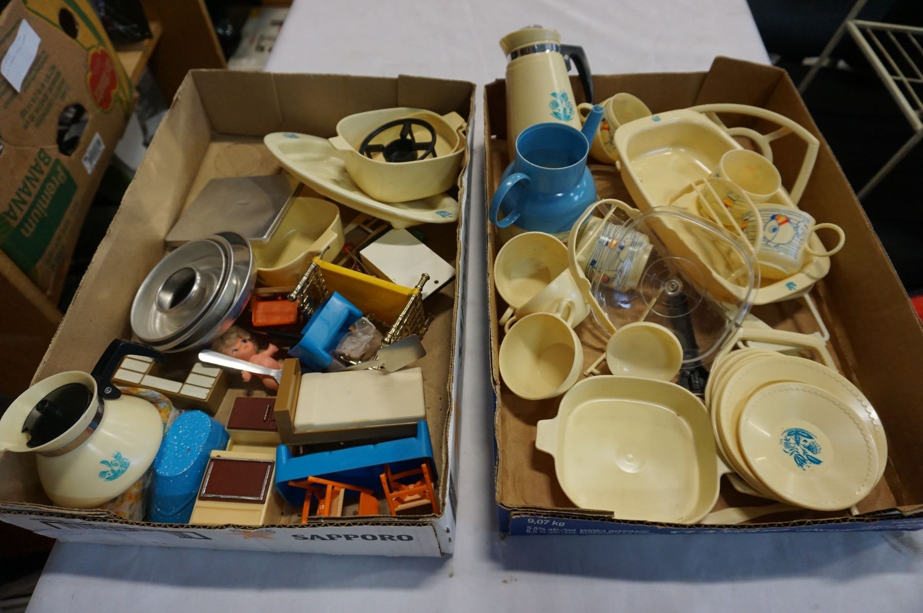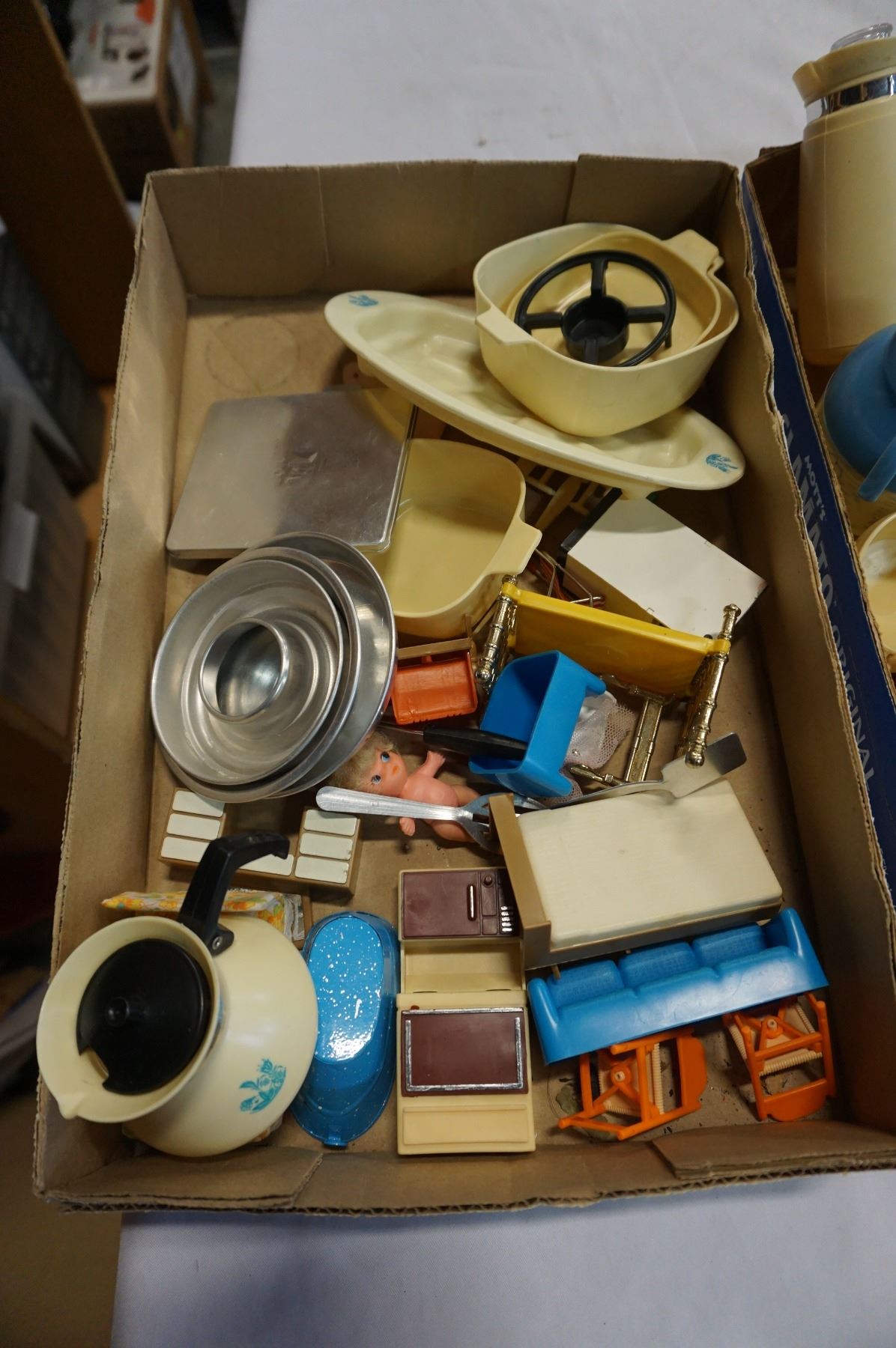 2 TRAYS OF DOLL HOUSE TOYS AND KITCHEN DISH PLAYSET