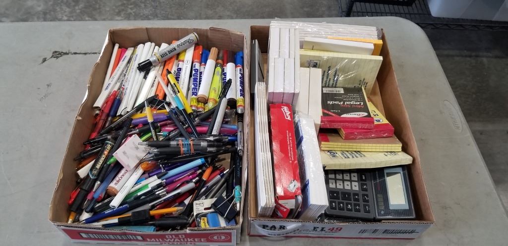 2 TRAYS OF OFFICE SUPPLY, PAPER PADS, PENS AND CONSTRUCTION PENCILS ETC