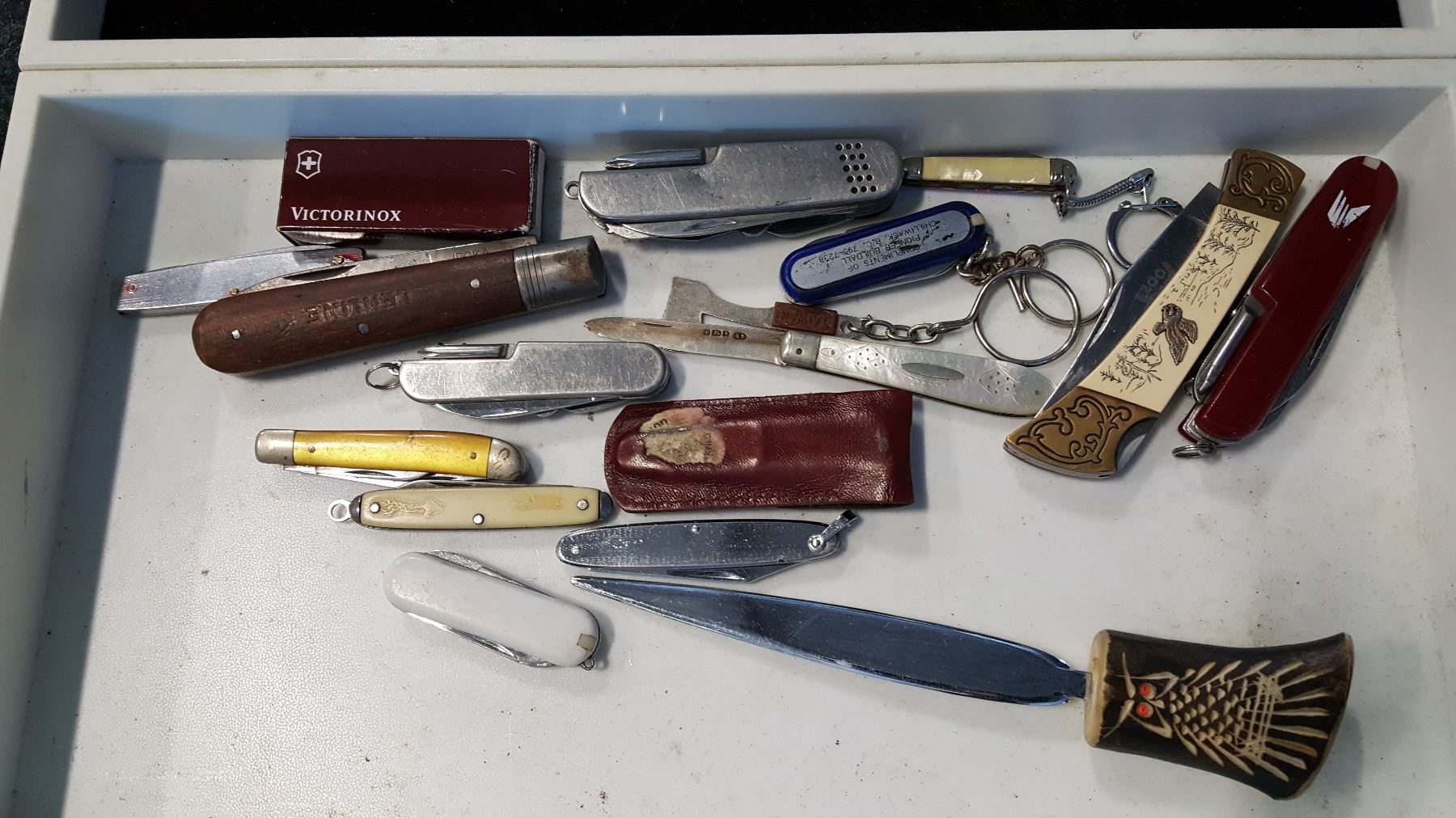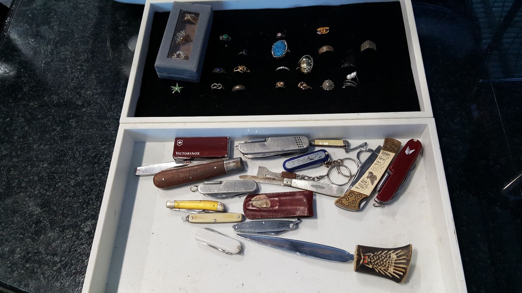 2 TRAYS OF POCKET KNIVES AND RINGS