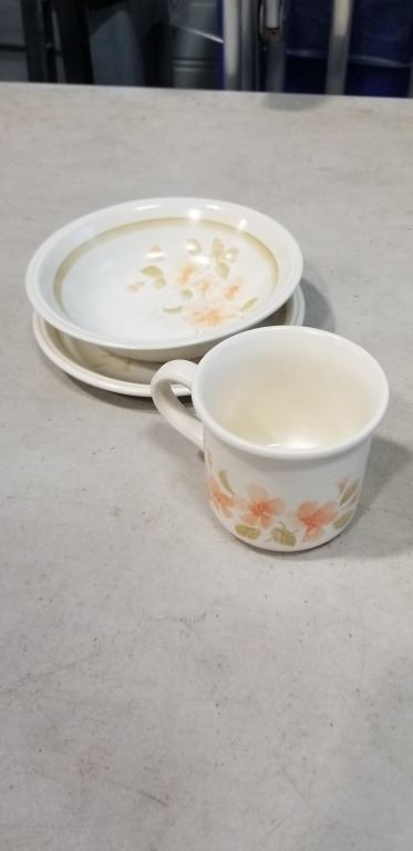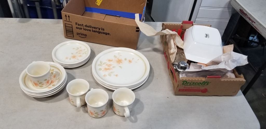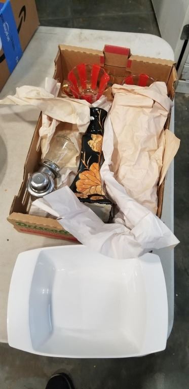 2 TRAYS OF STONE DISHWARE, CANDLE HOLDERS, ETC