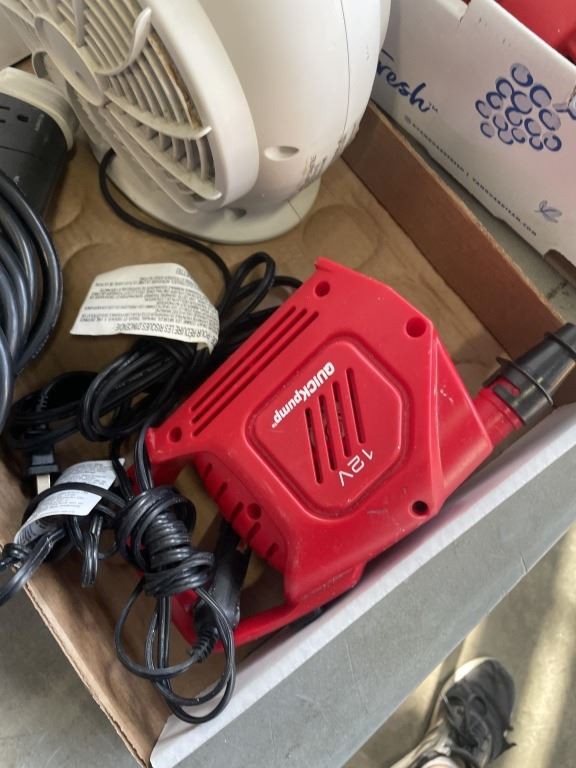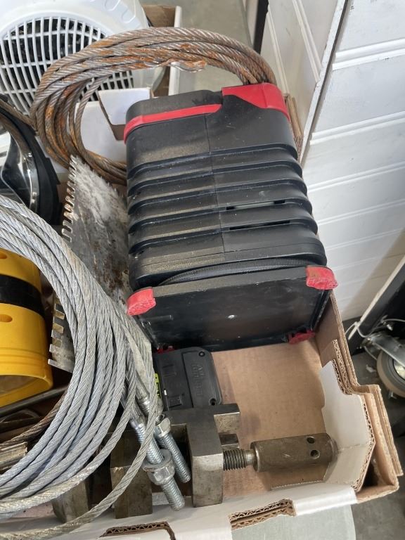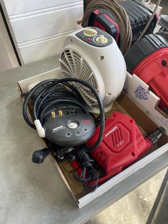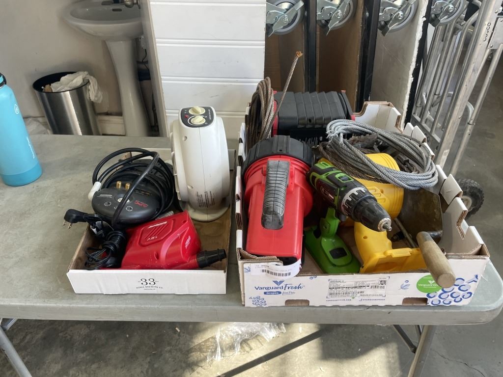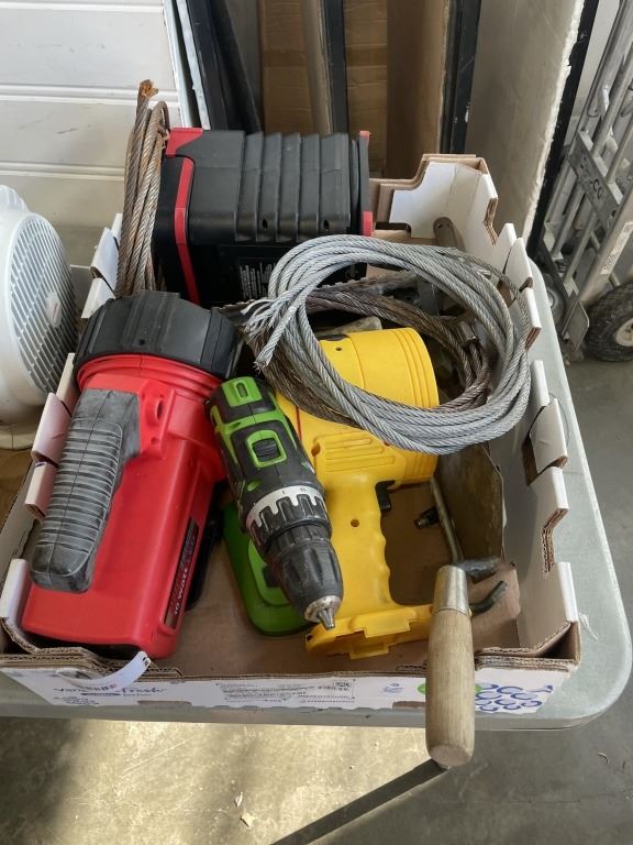2 TRAYS OF TOOLS, FAN, CABLES, ETC