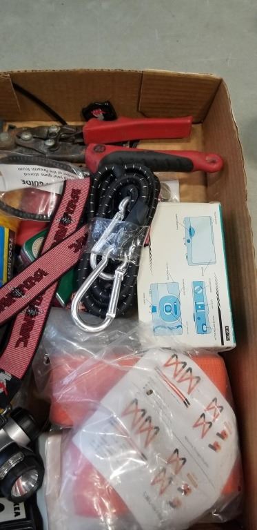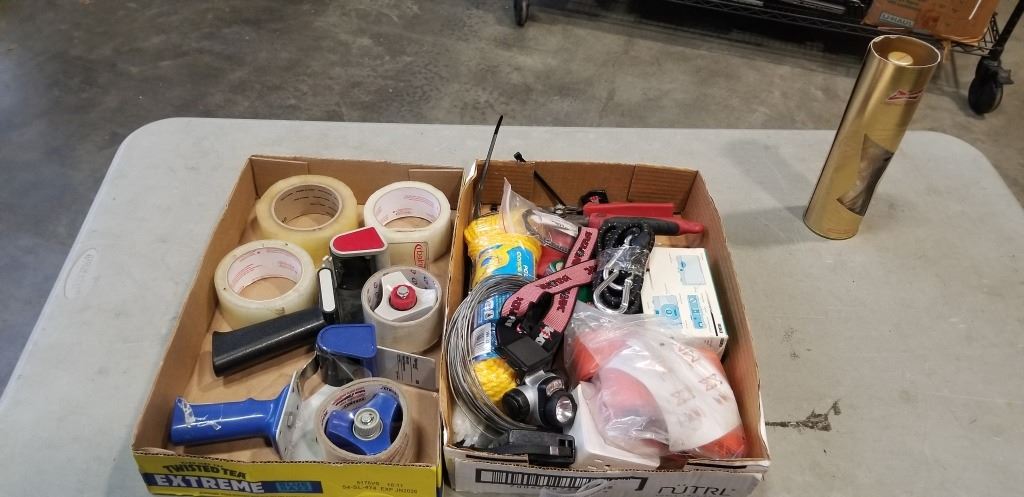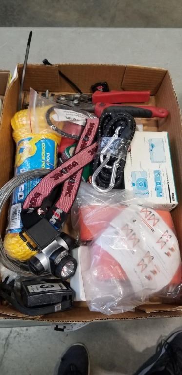 2 TRAYS OF TOOLS, HEADLAMPS, TAPE GUNS ETC
