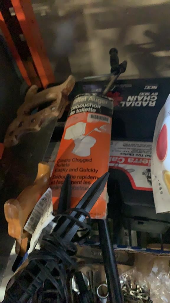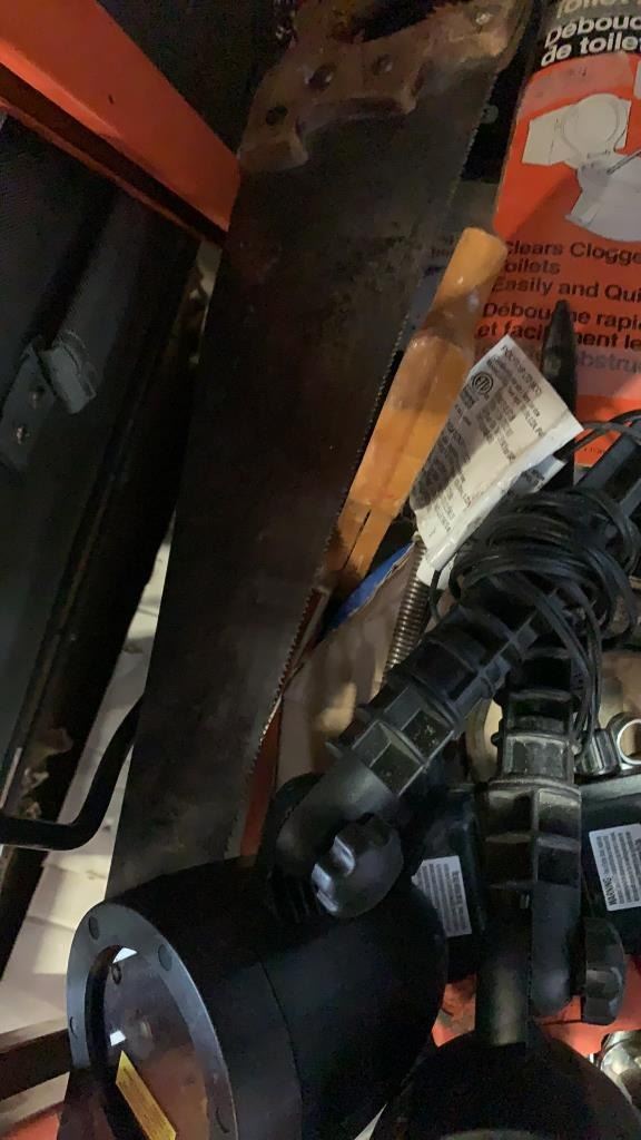 2 TRAYS OF TOOLS, TIRE CHAINS, SAWS