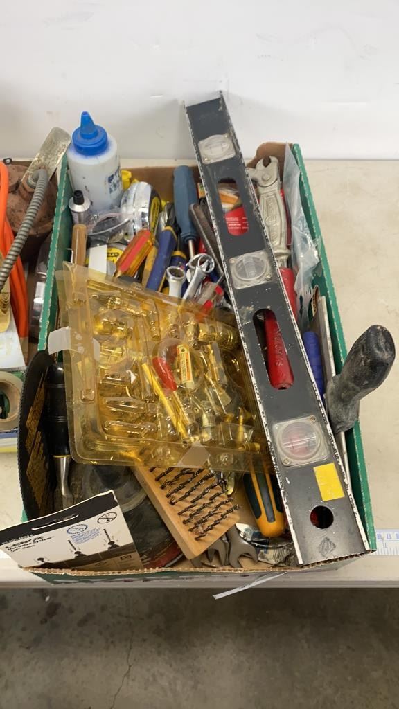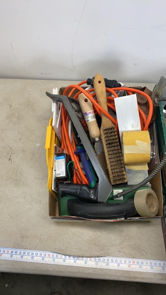 2 TRAYS OF TOOLS, WIRE BRUSHES, EXTENTION CORDS, OIL CAN