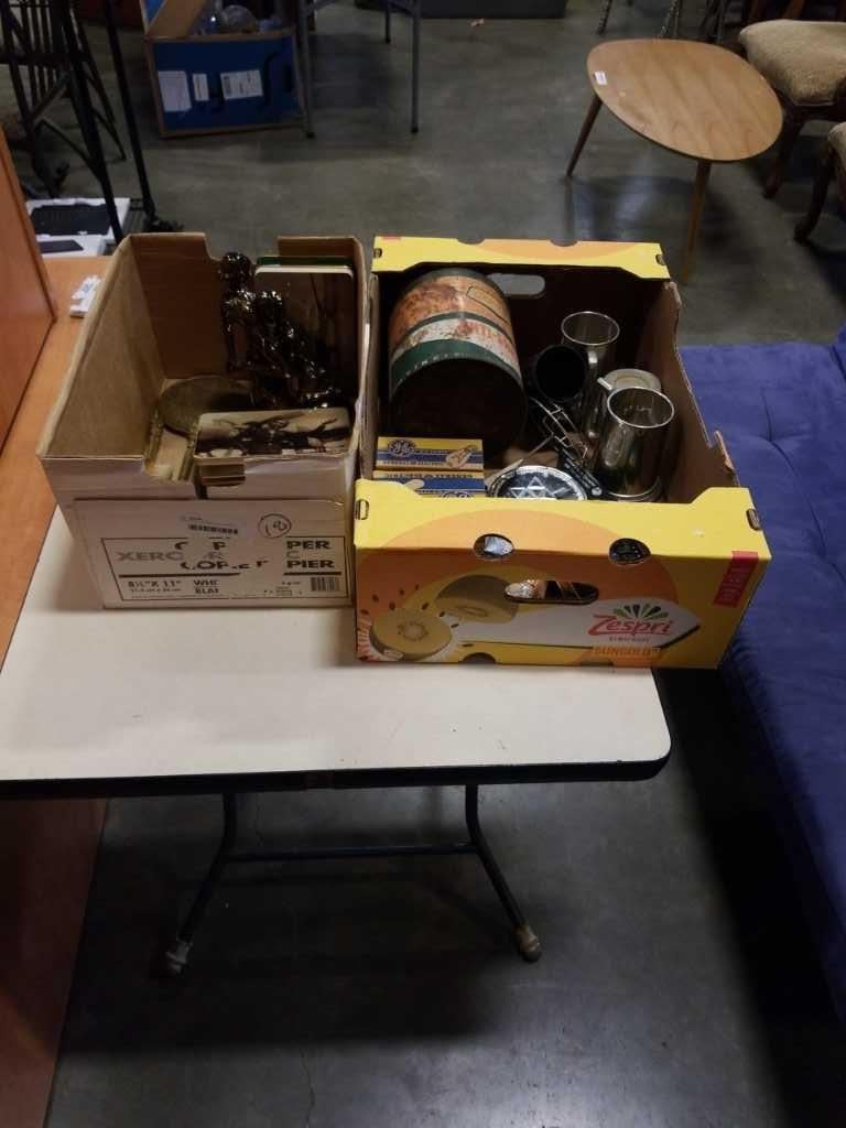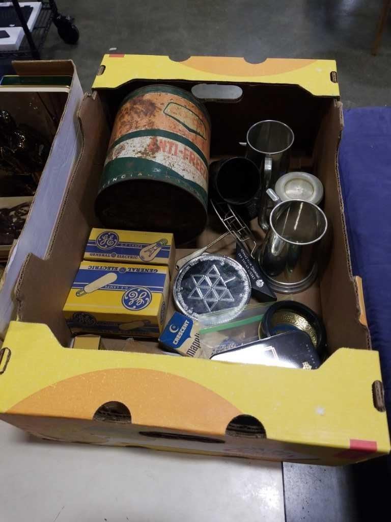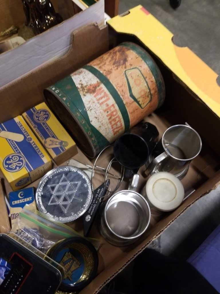 2 TRAYS OF VINTAGE COLLECTIBLES: VANITY SET, AIRPLANE GIFT SETS AND MORE