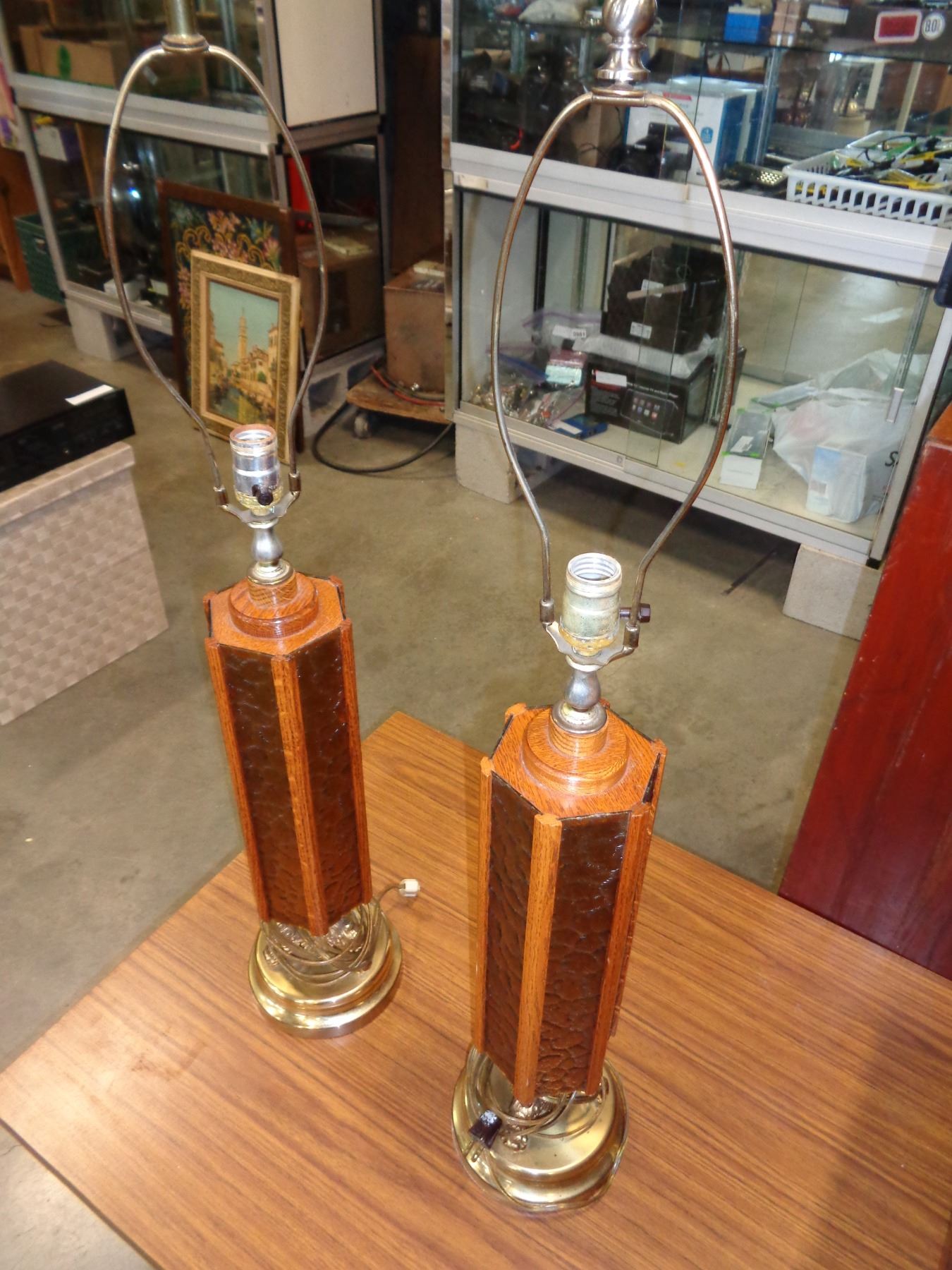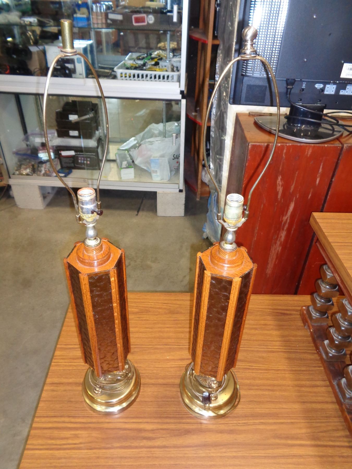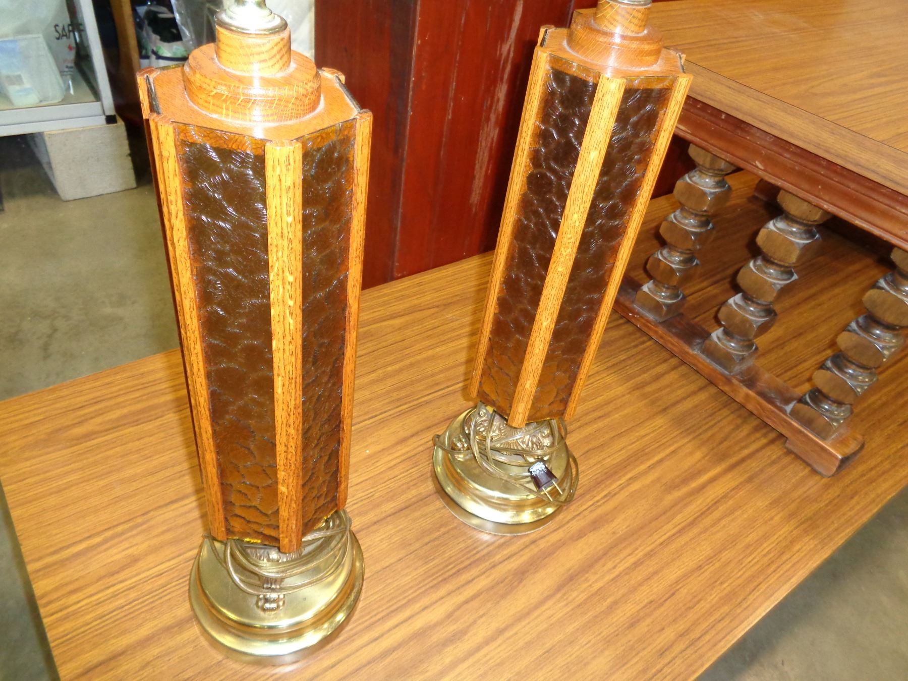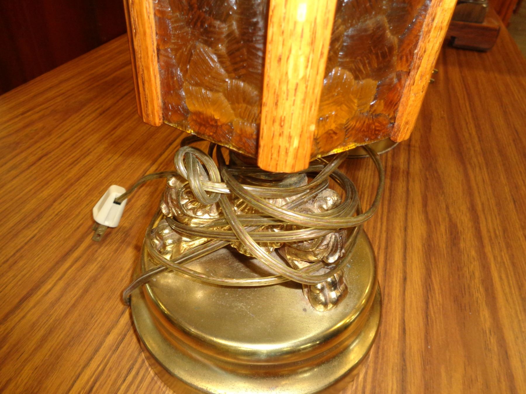2 VINTAGE BRASS AND AMBER SHADE LAMPS