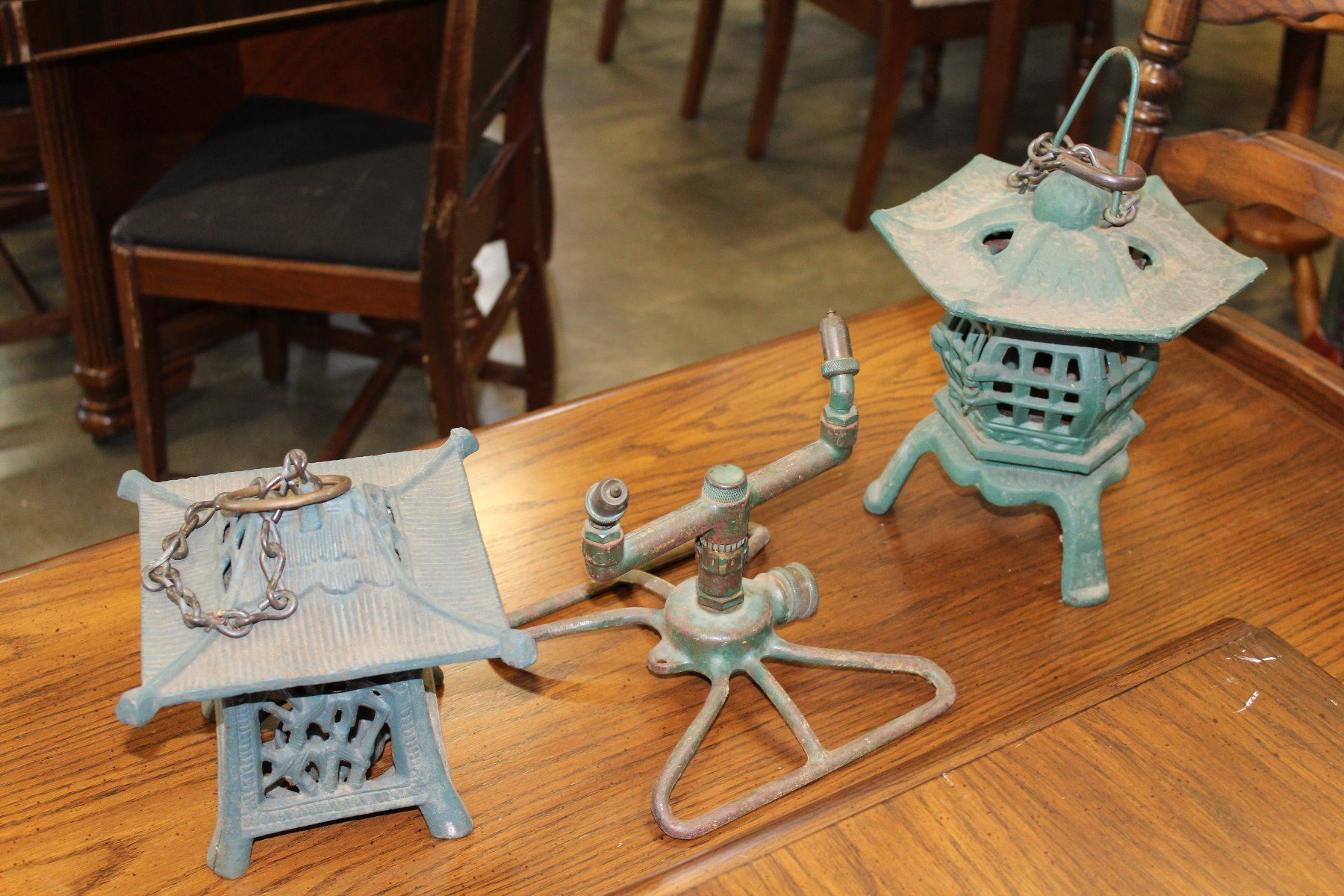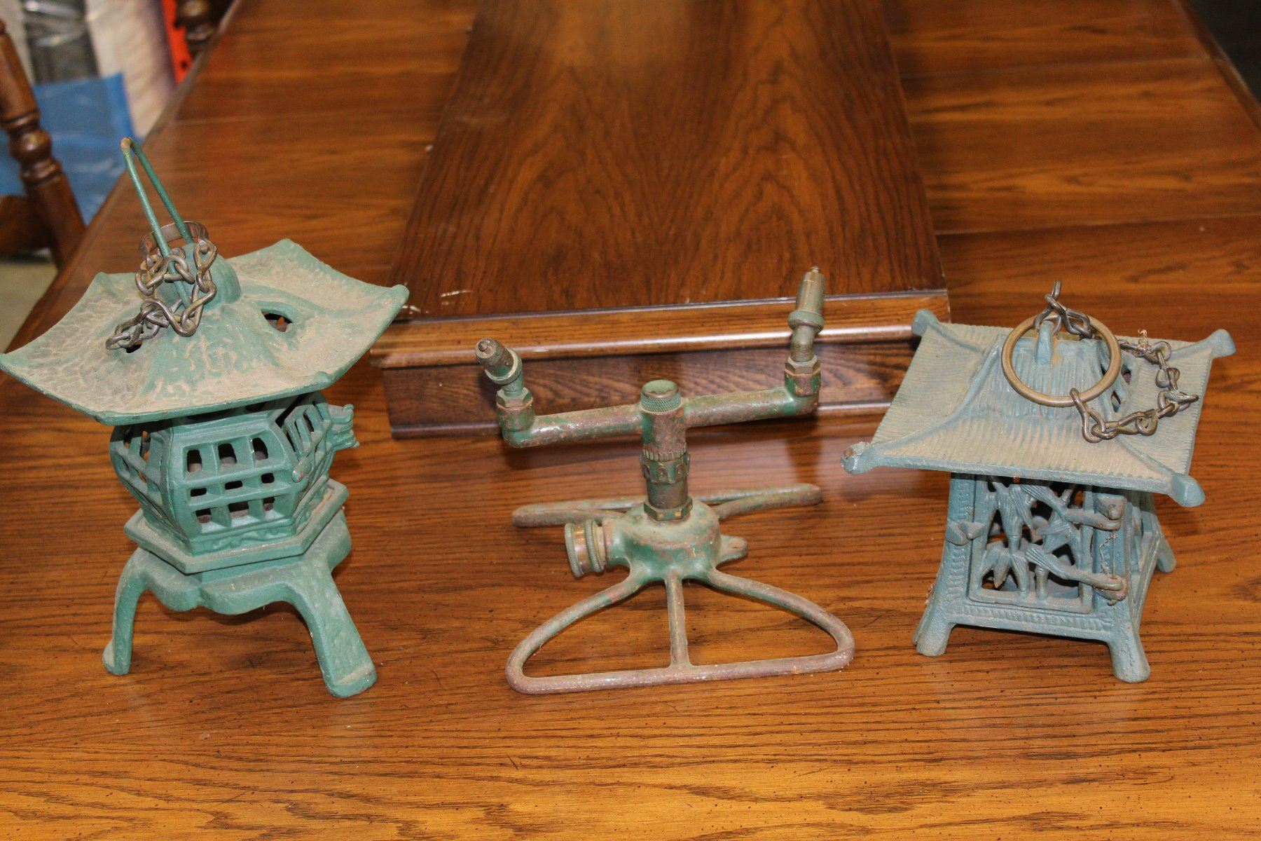 2 VINTAGE CAST POGODA LANTERNS + CAST SPINKLERS