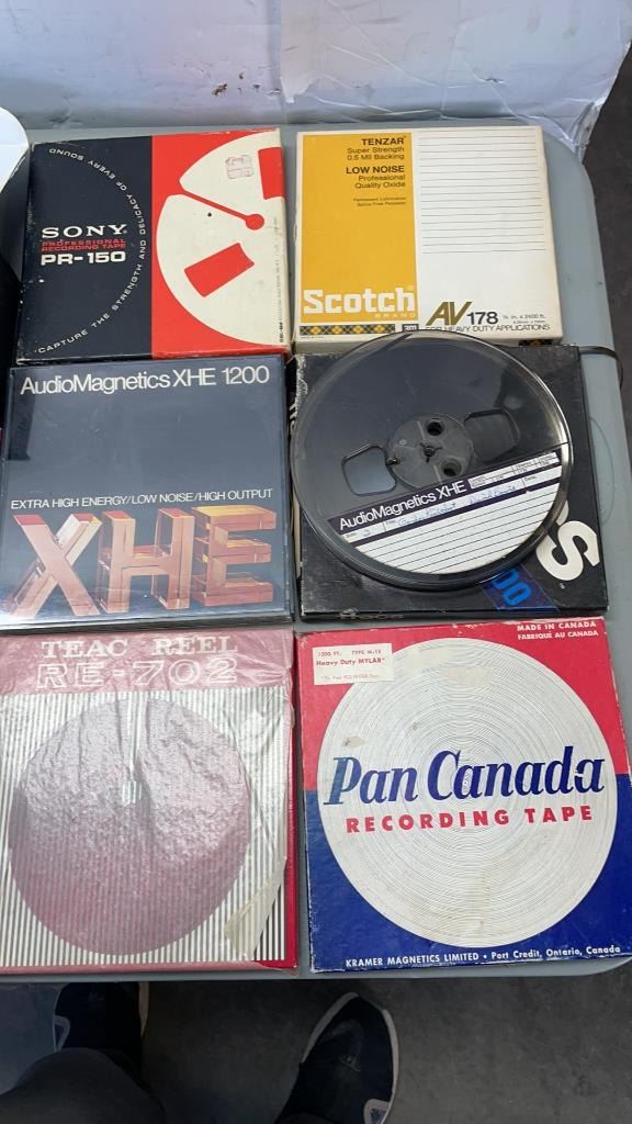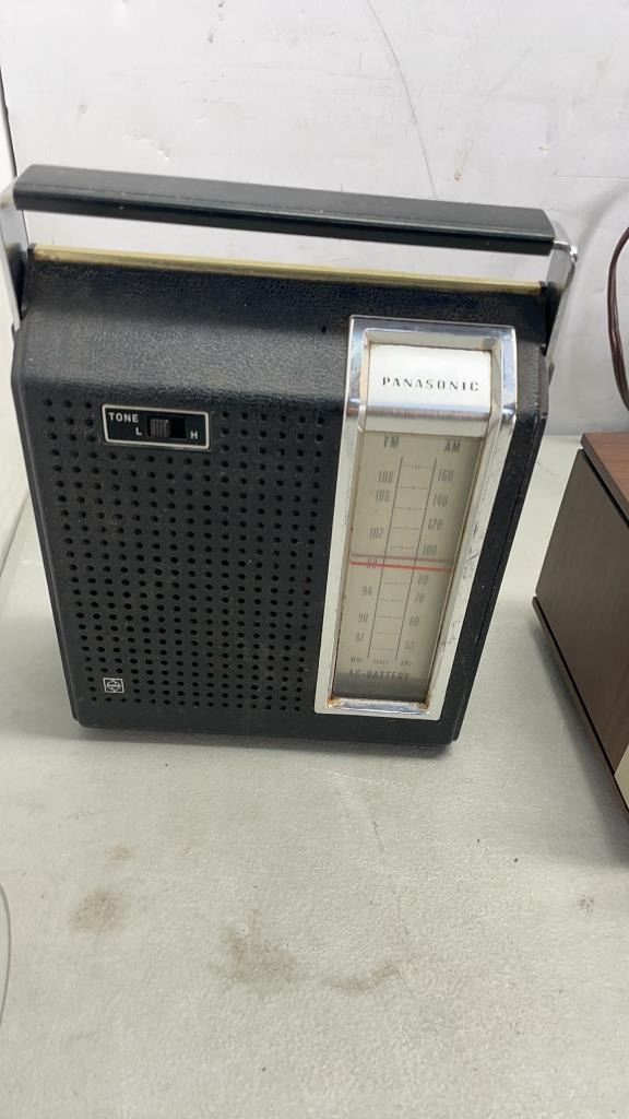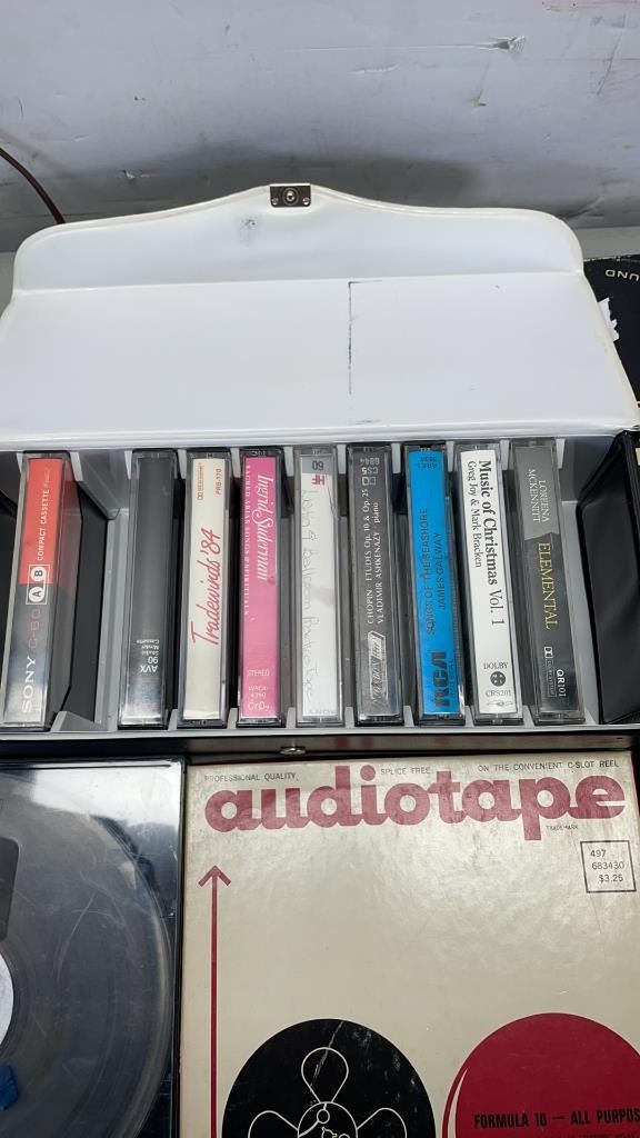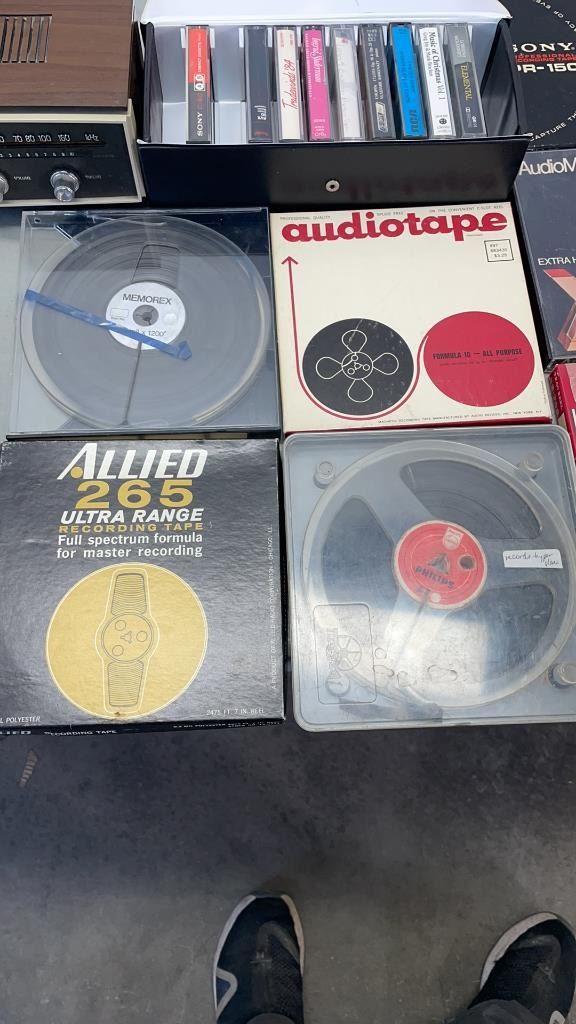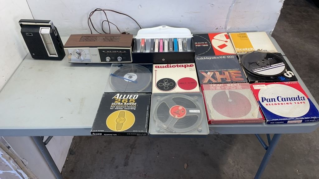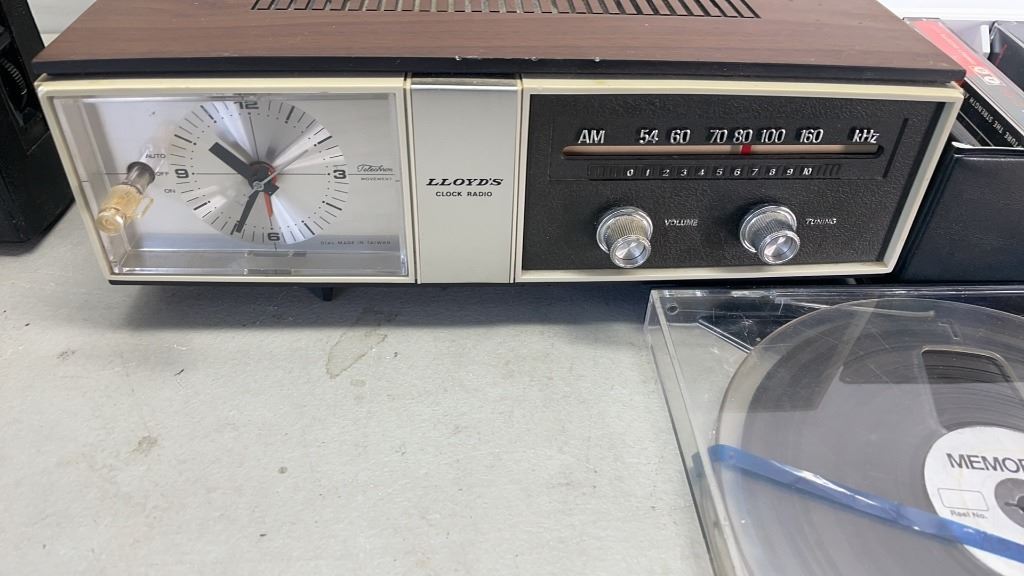 2 VINTAGE CLOCK RADIOS, CASSETTE BOX AND REELTO REEL TAPES