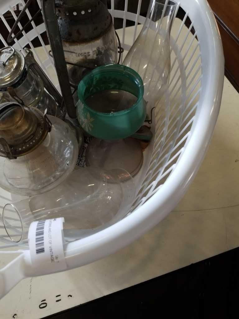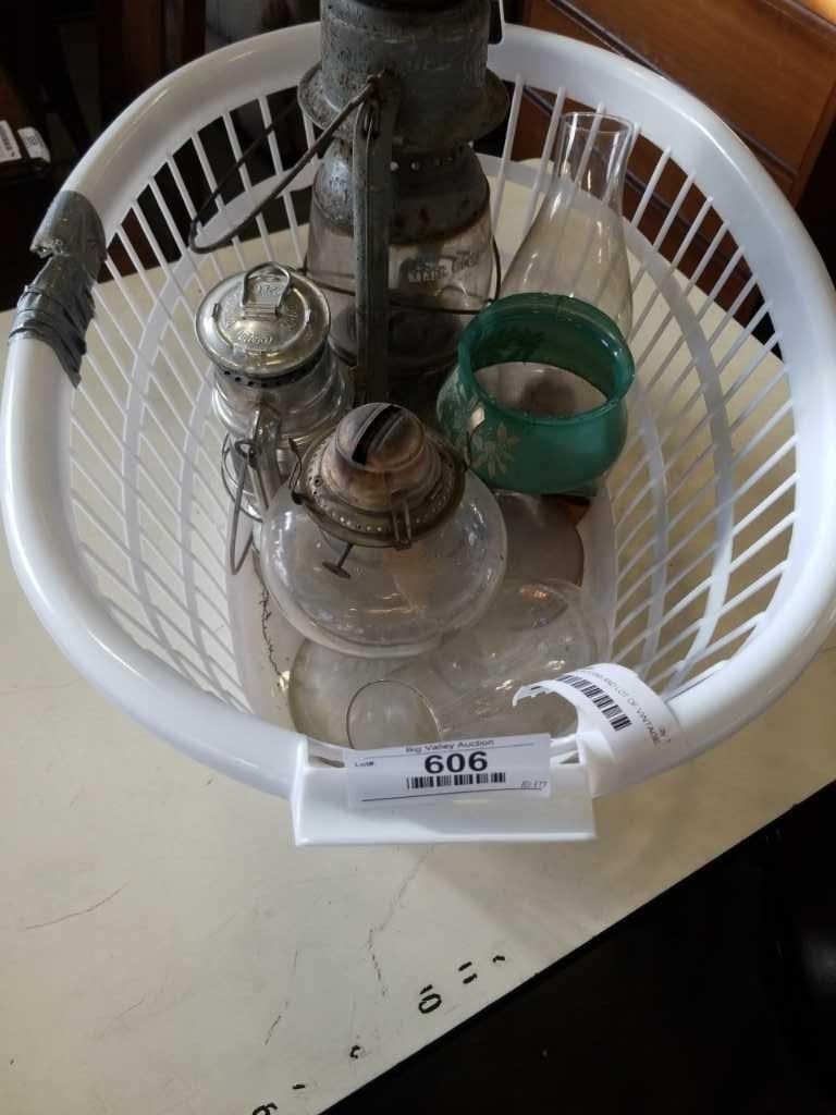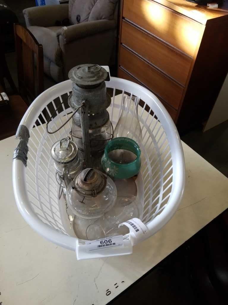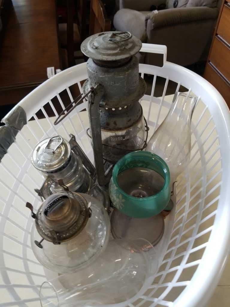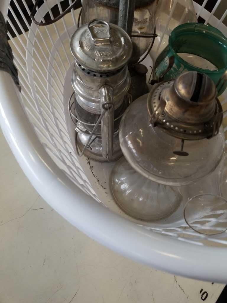 2 VINTAGE LANTERNS AND LOT OF VINTAGE OIL LAMP PARTS