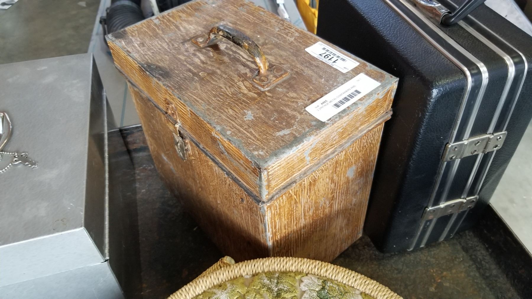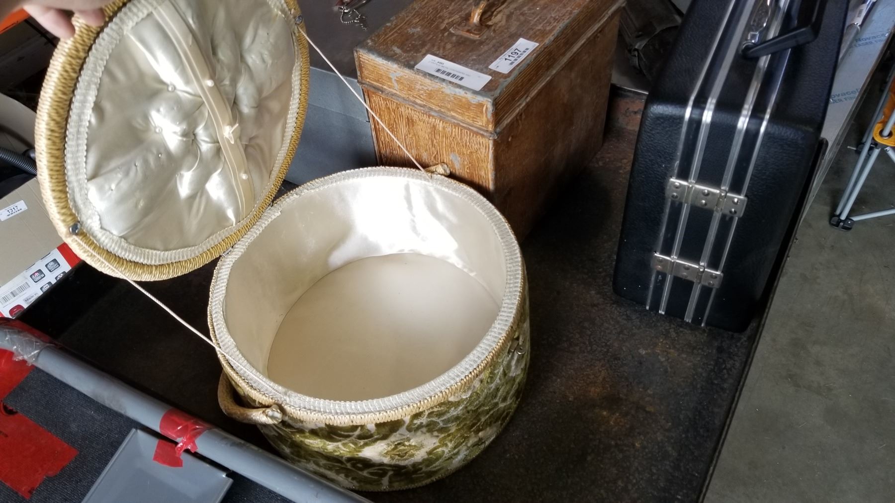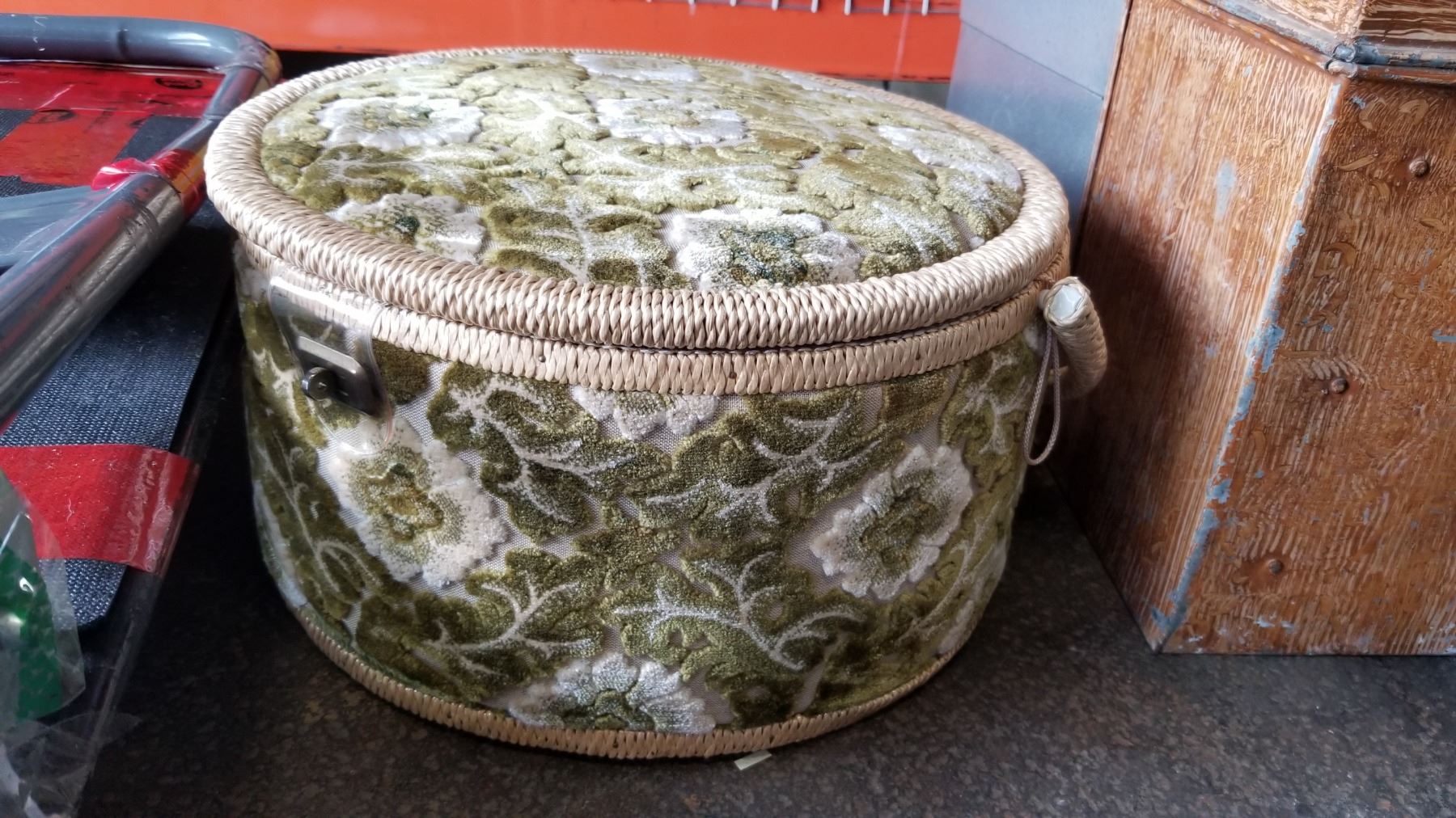 2 VINTAGE METAL CONTAINERS AND SEWING BASKET AND LIQUOR CASE