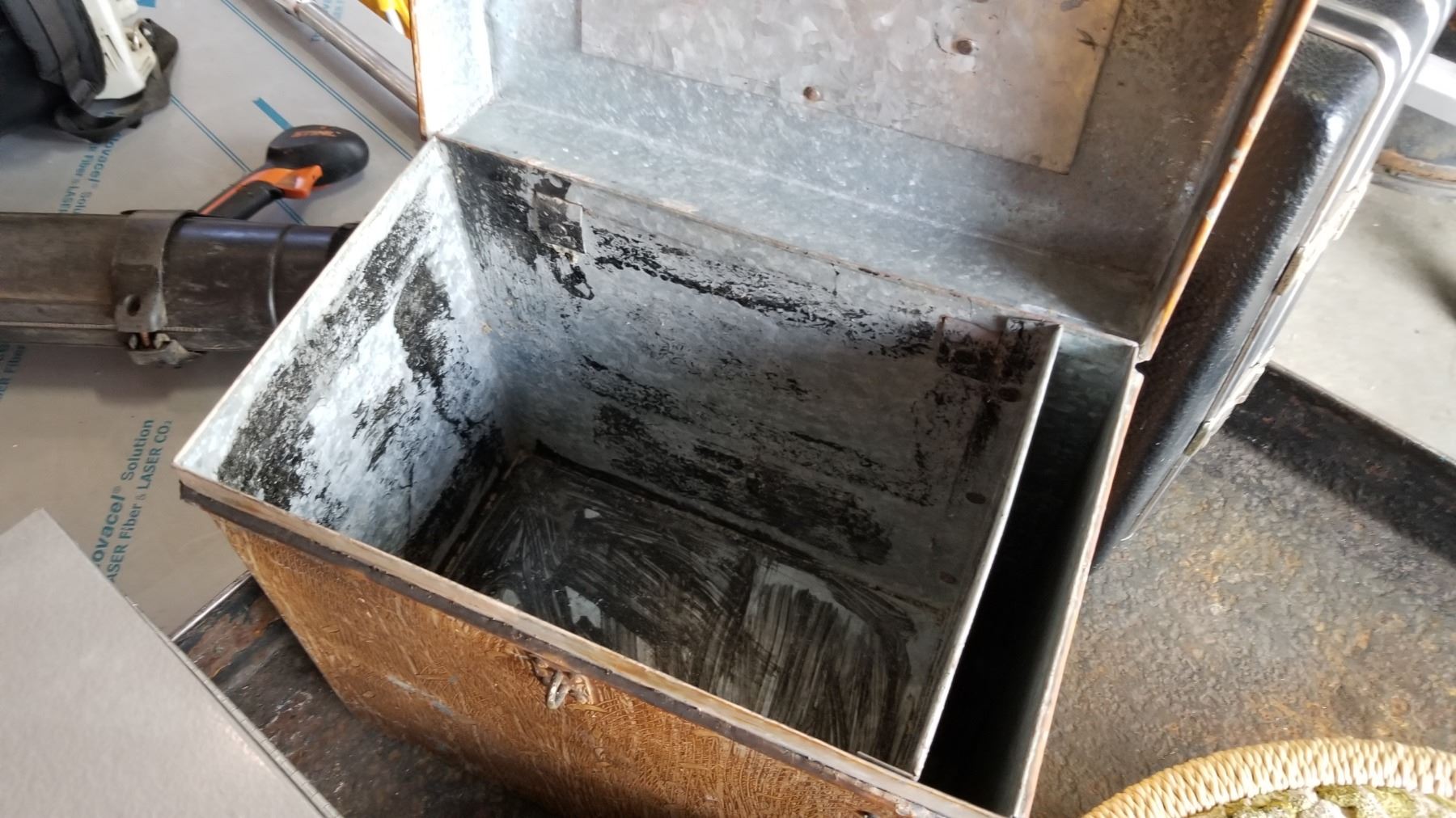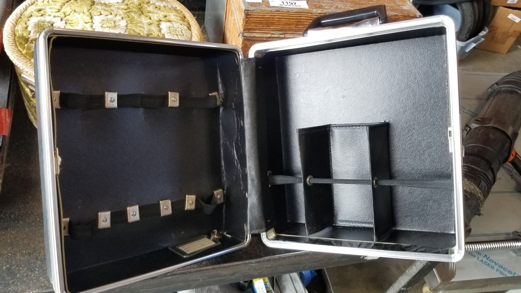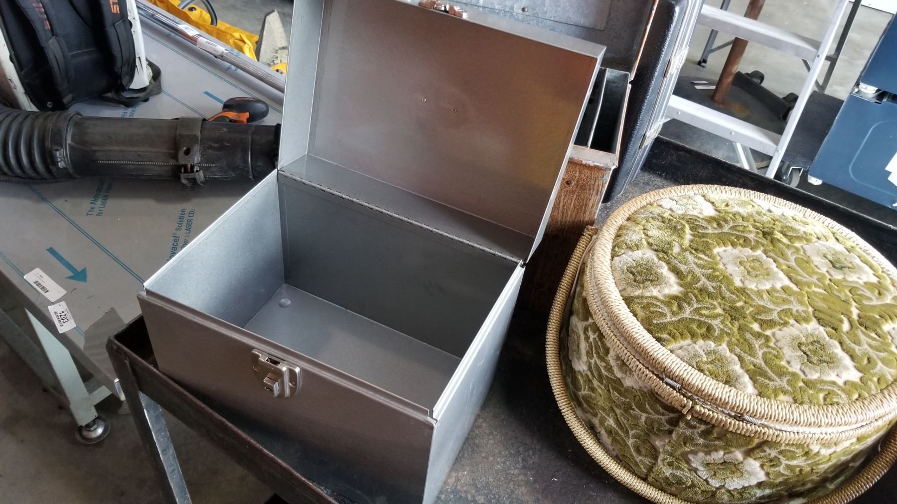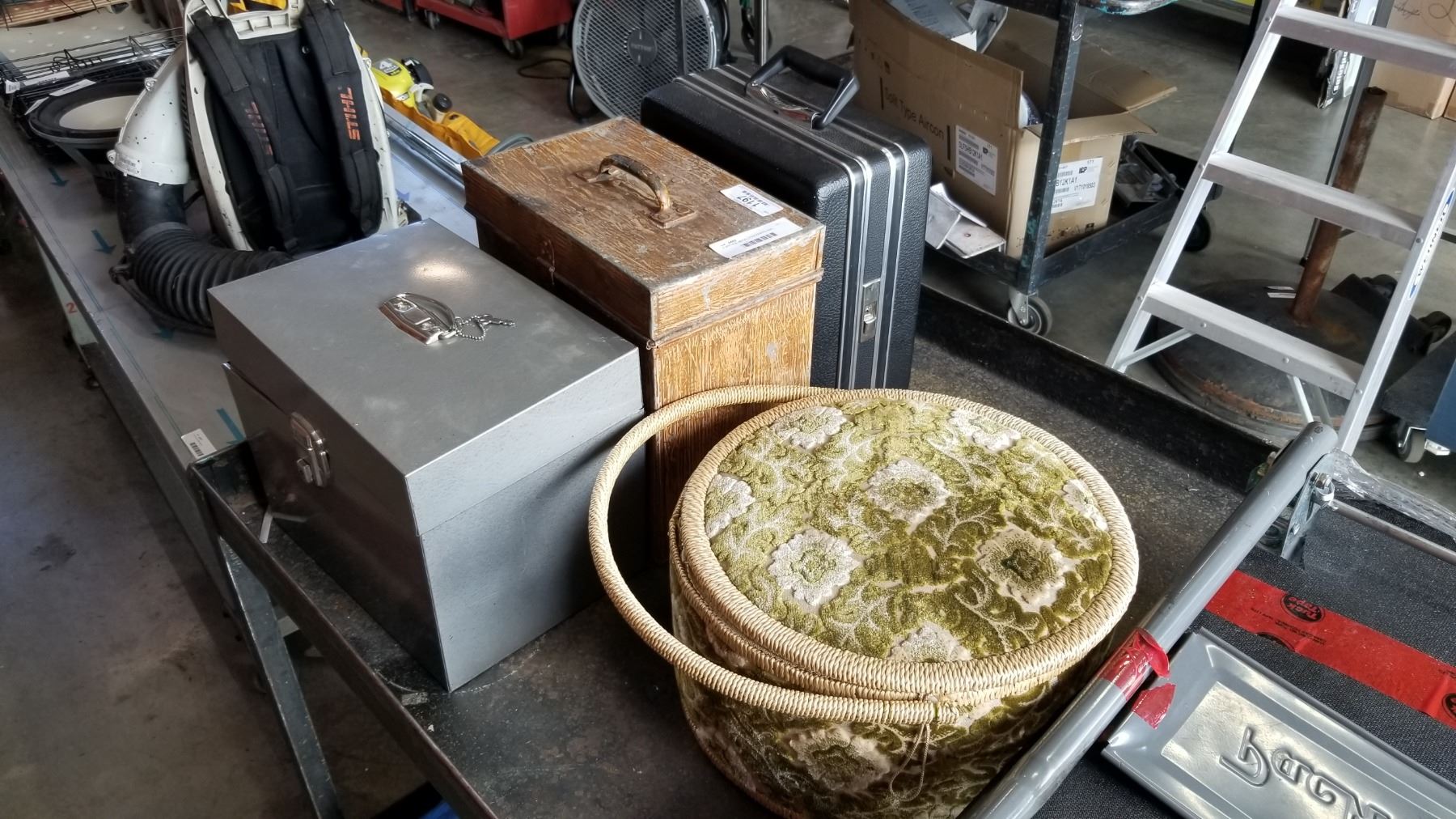 2 VINTAGE METAL CONTAINERS AND SEWING BASKET AND LIQUOR CASE