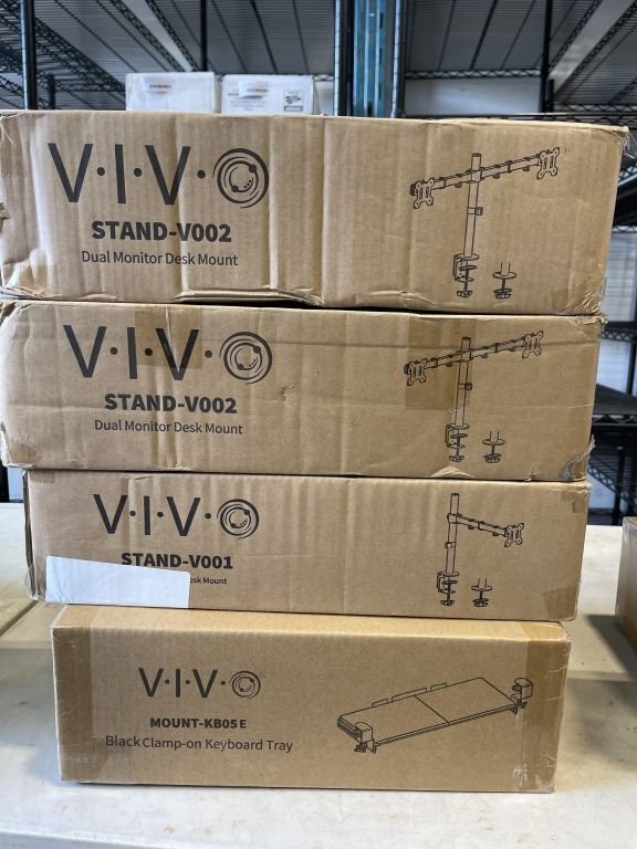 2 VIVO DUAL MONITOR DESK MOUNTS, SINGLE MONITOR DESK MOUNT, AND KEYBAORD TRAY