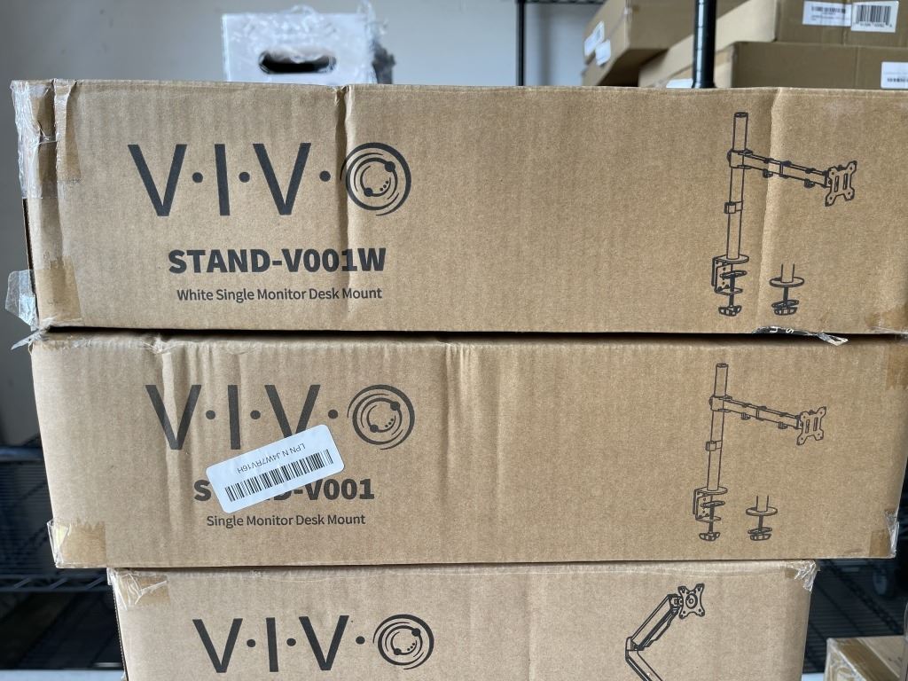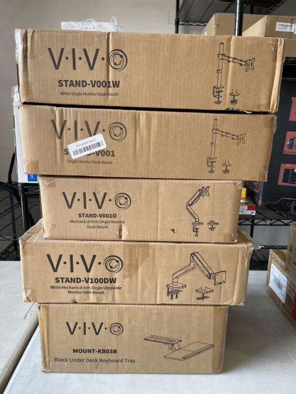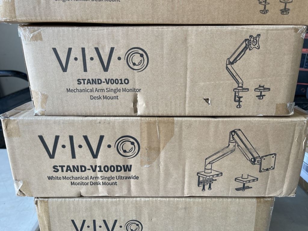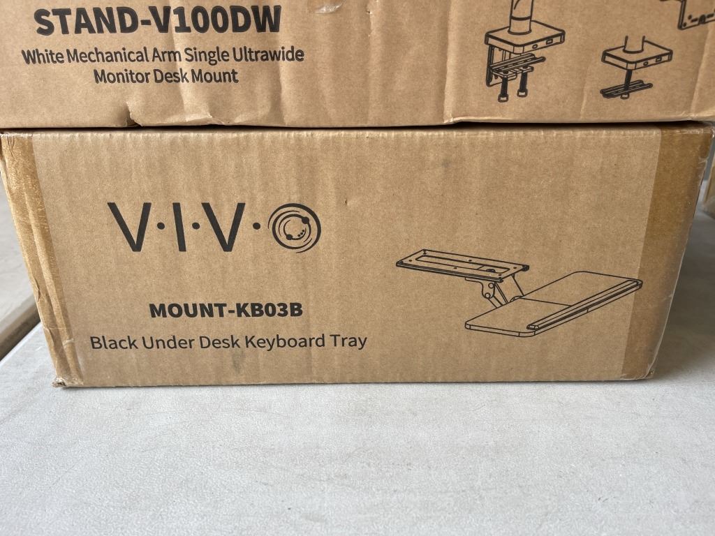 2 VIVO MECHANICAL SINGLE ARM DESK MOUNTS, 2 VIVO SINGLE MONITOR DESK MOUNTS AND KEYBOARD TRAY