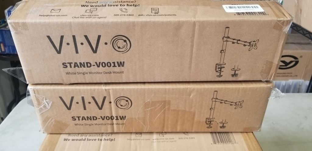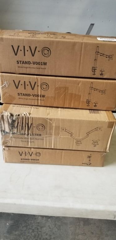 2 VIVO SINGLE MONITOR DESK MOUNTS, VIVO PNEUMATIC ARM DUAL MONITOR DESK MOUNT, AND SINGLE MONITOR DE