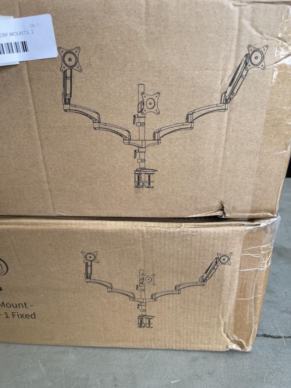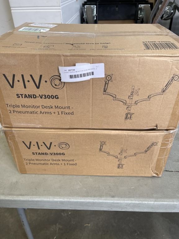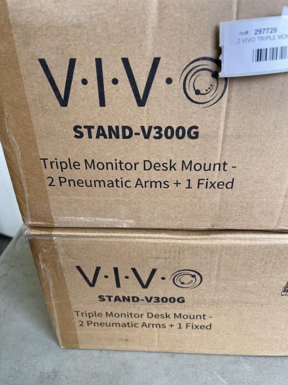 2 VIVO TRIPLE MONITOR DESK MOUNTS, 2 PNEUMATIC ARMS AND ONE FIXED
