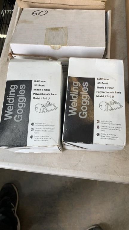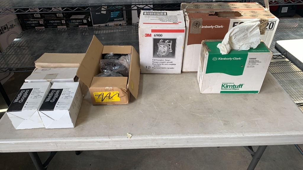 2 WELDING GOGGLES, 2 BOXES OF REPLACEMENT LENSES, FULL FACEPIECE RESPIRATOR, DISPOSABLE RESPIRATORS AND KIM TOWELS AND REINFORCED WIPES