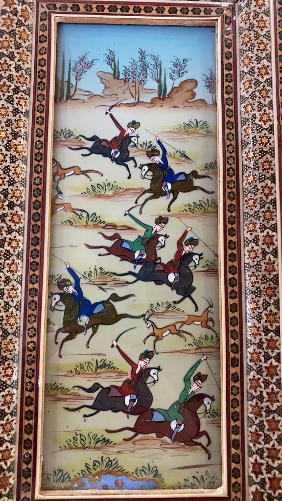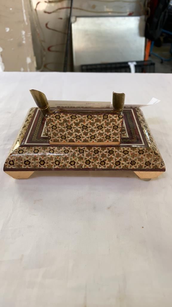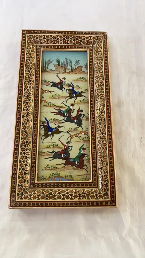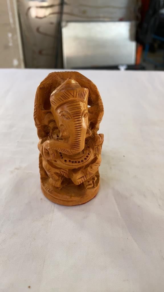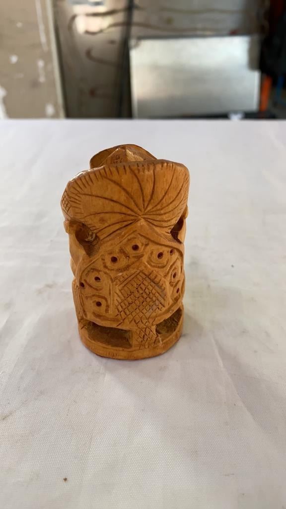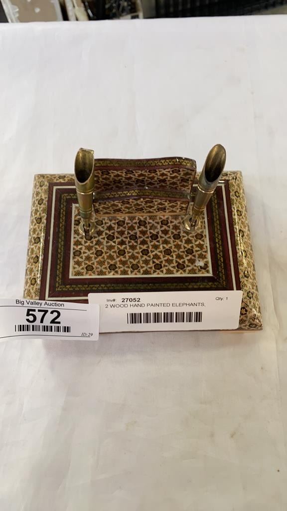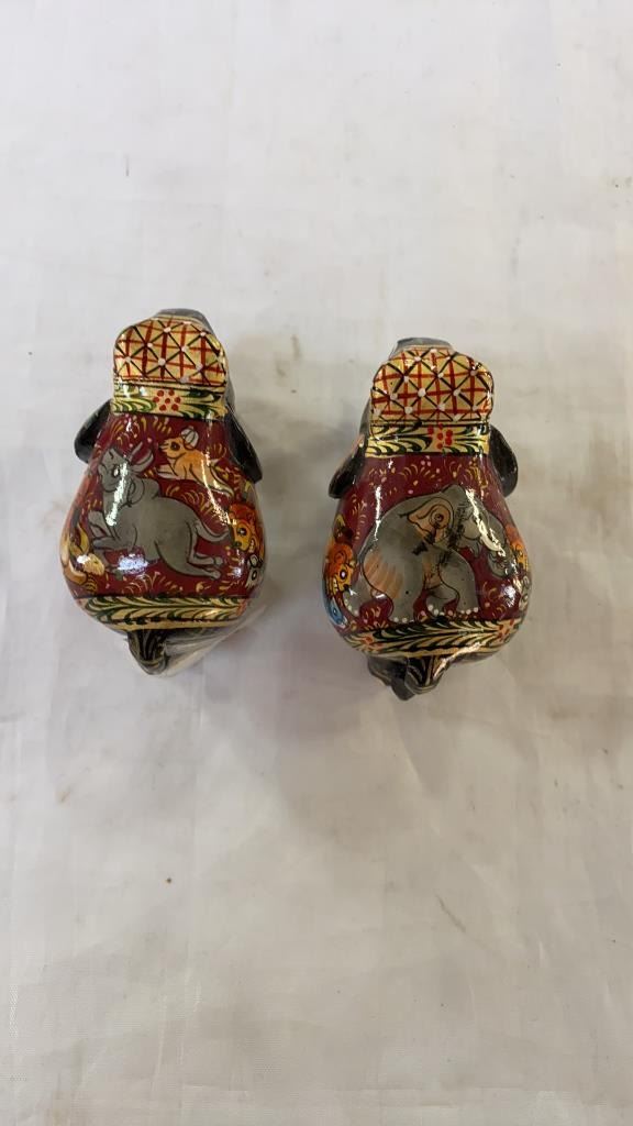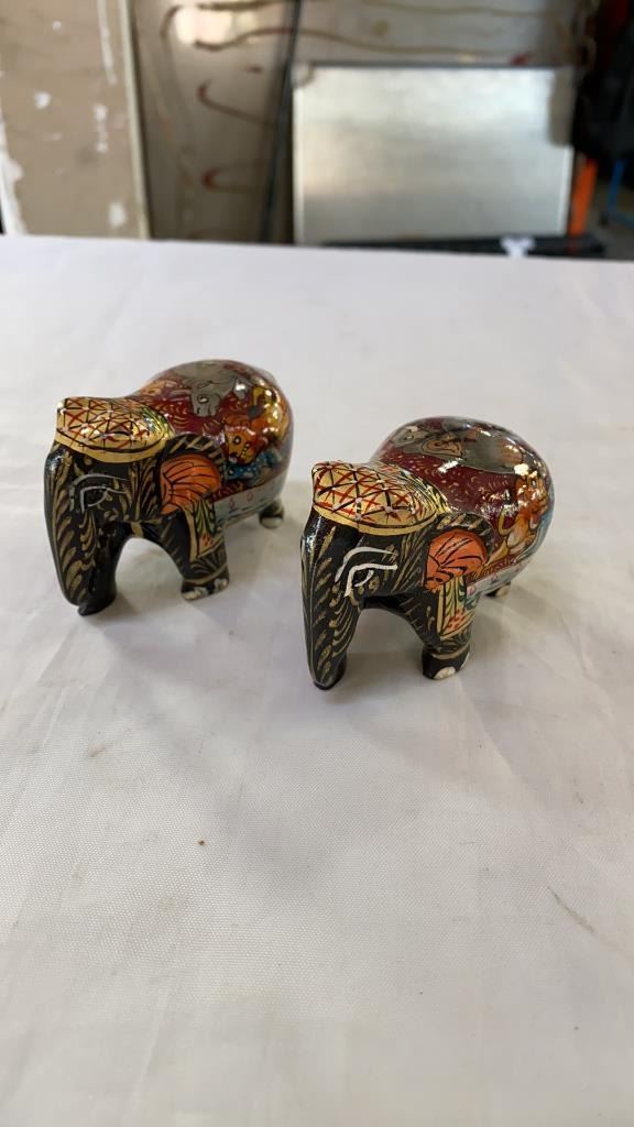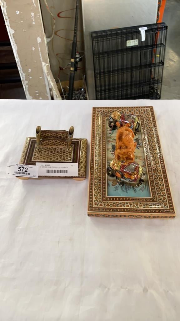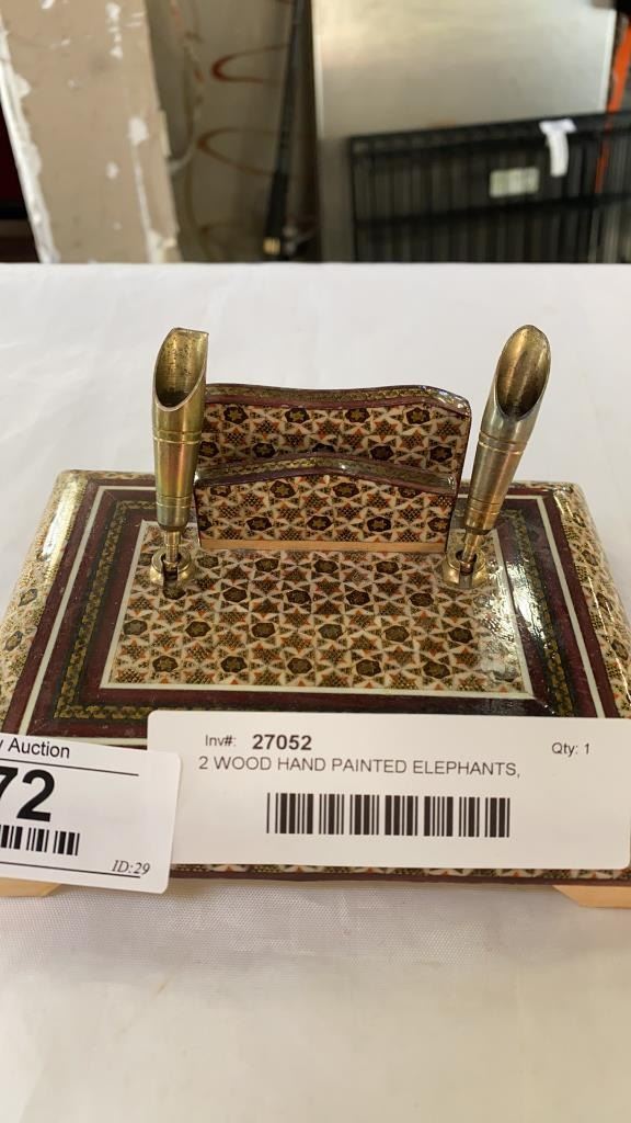 2 WOOD HAND PAINTED ELEPHANTS, WOOD CARVING, PEN HOLDER, AND ORIENTAL WALL HANGING