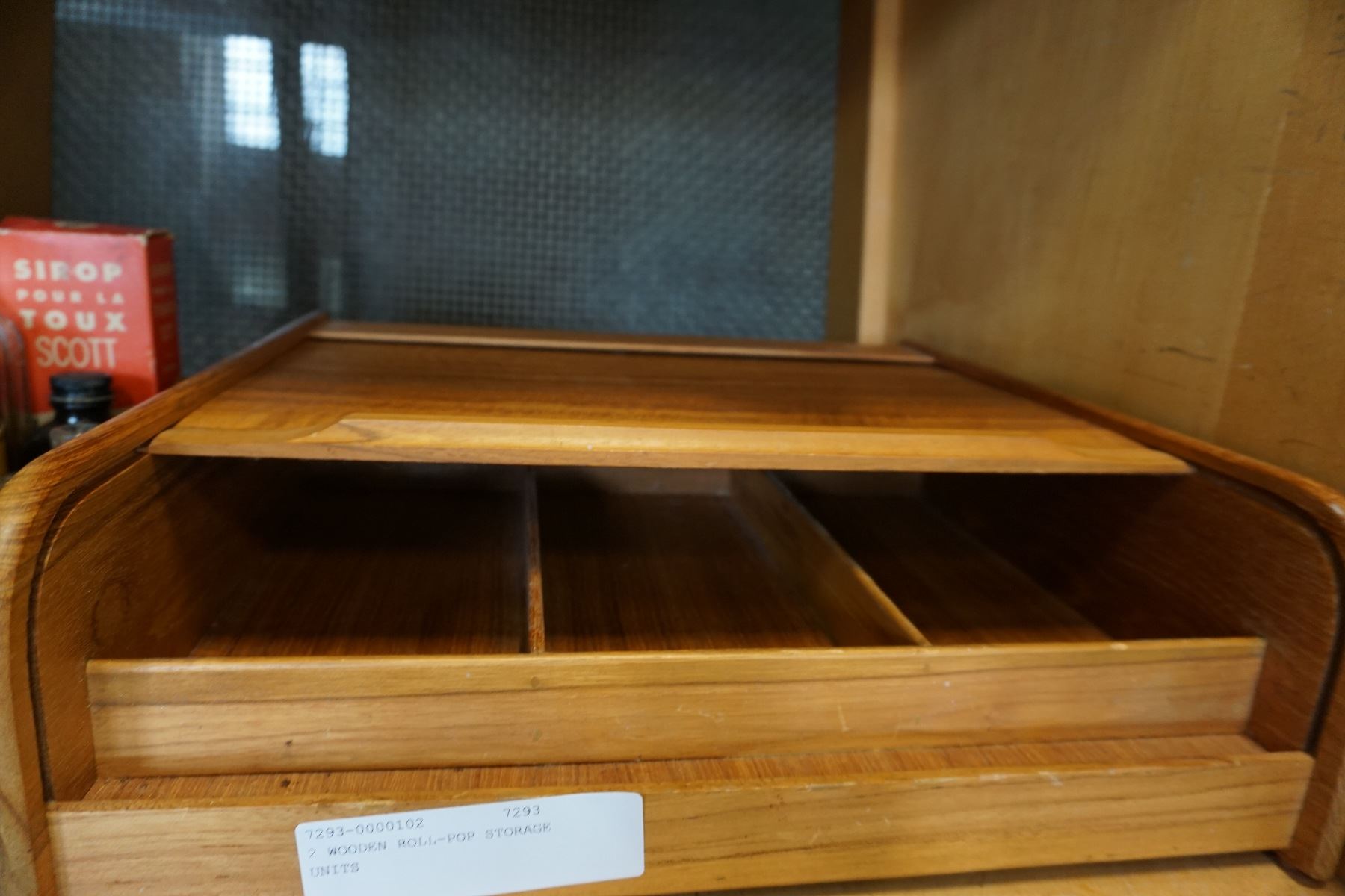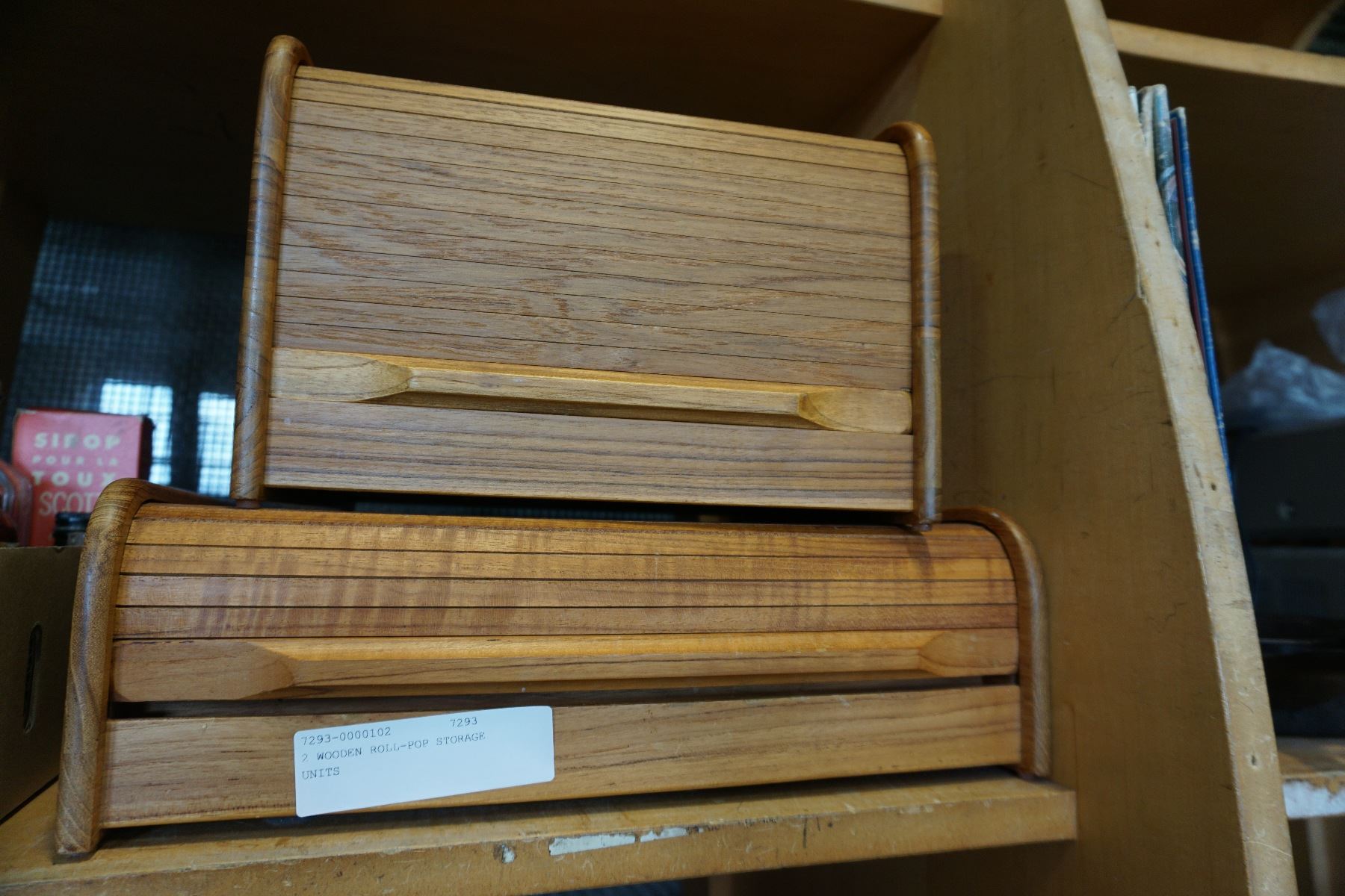 2 WOODEN ROLL-POP STORAGE UNITS