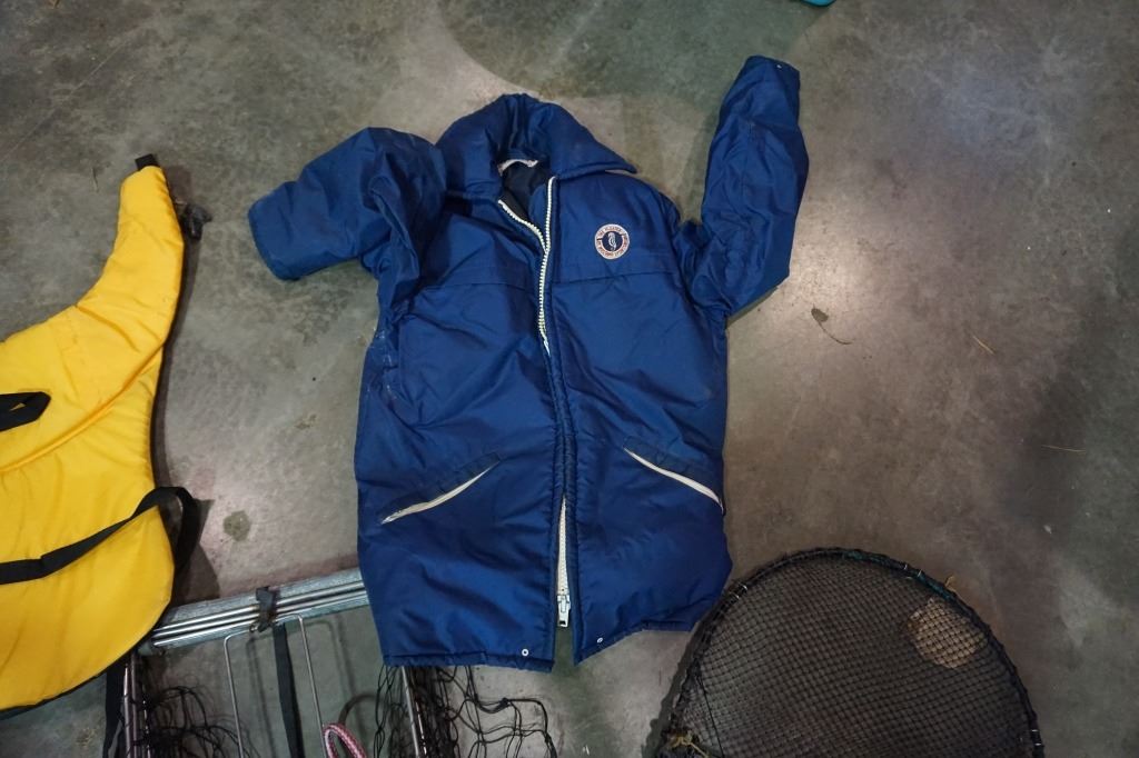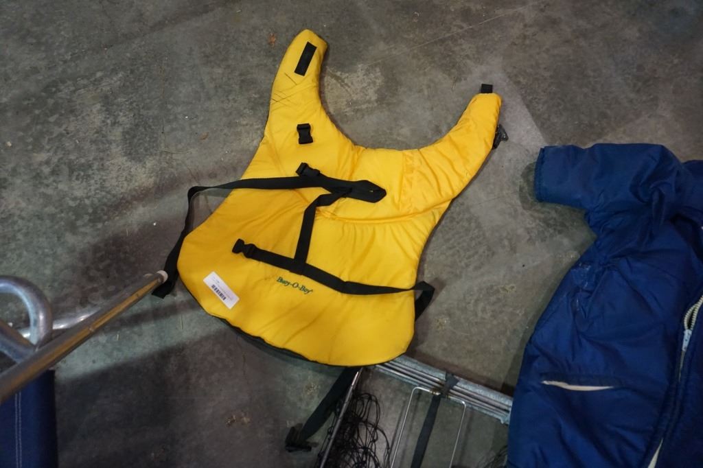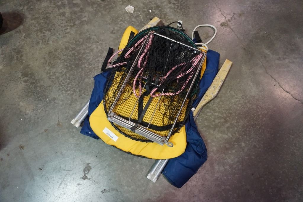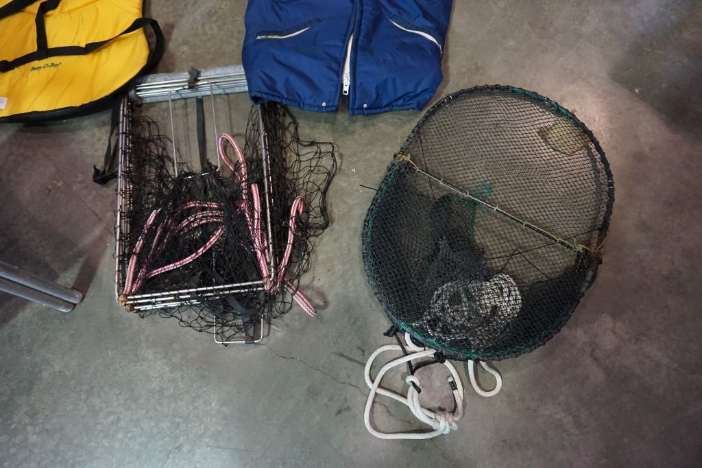 2 prawn traps large dog life jacket, mustang floater jacket and boat lawn chair